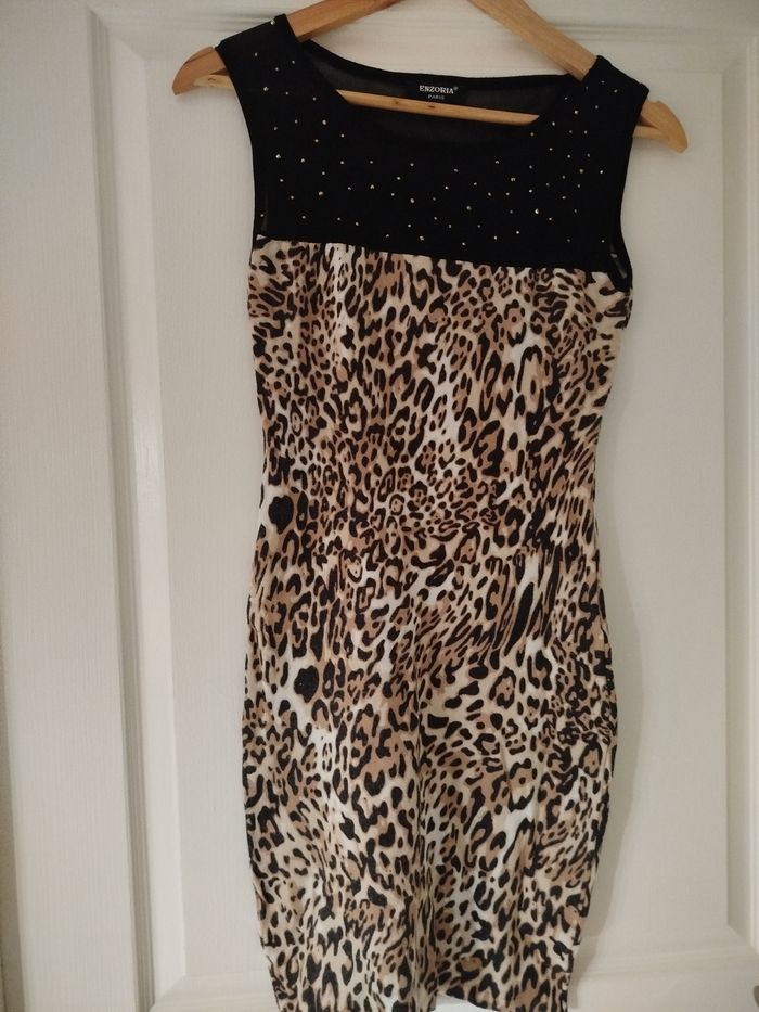 Vends très jolie robe moulante léopard le haut et en transparence (au dessus de la poitrine). Taille :36 Marque :Enzoria