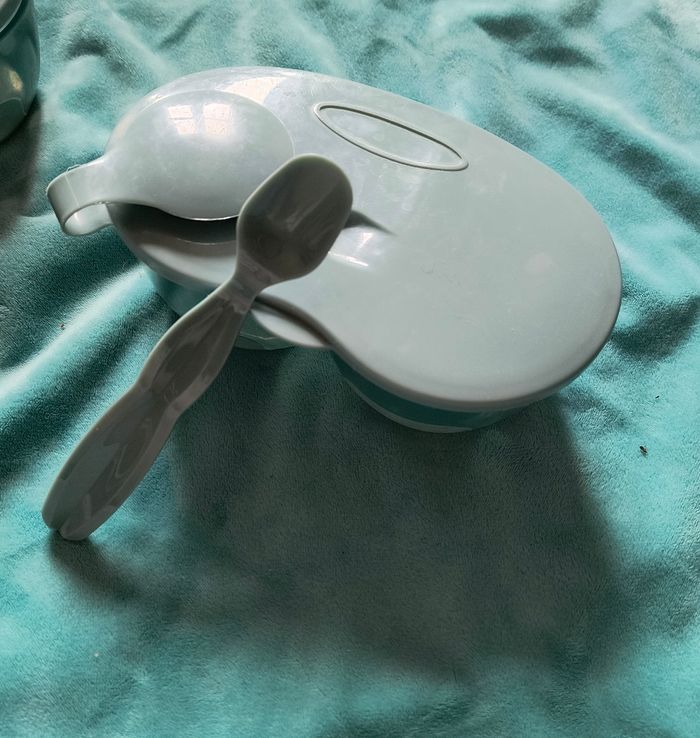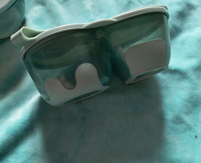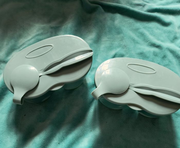 Deux boîtes de repas en extérieur avec cuillère intégrée. Bon état général, un peu utilisé et donc lavé
