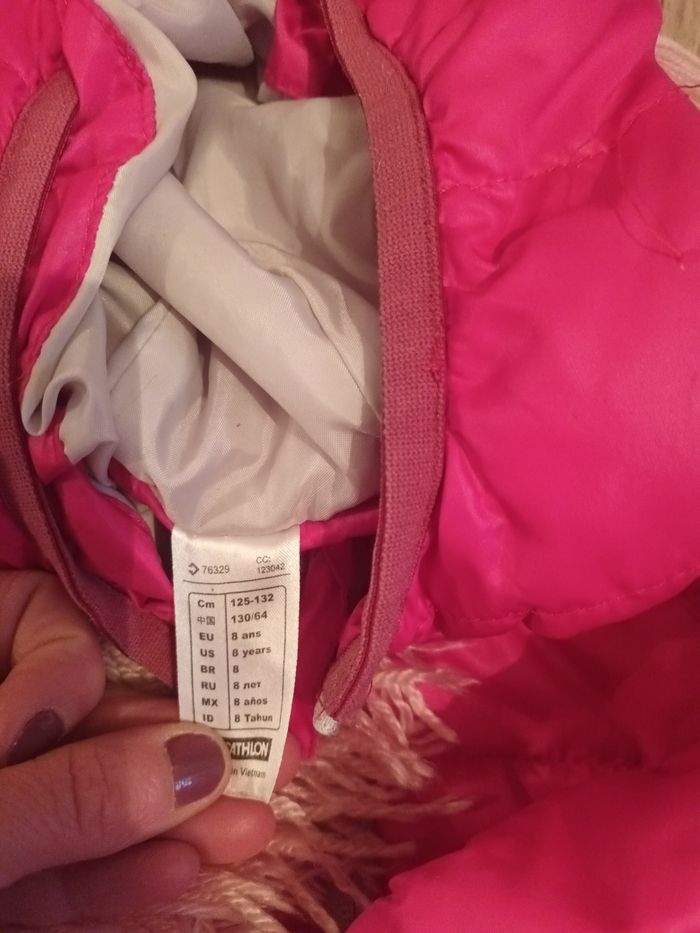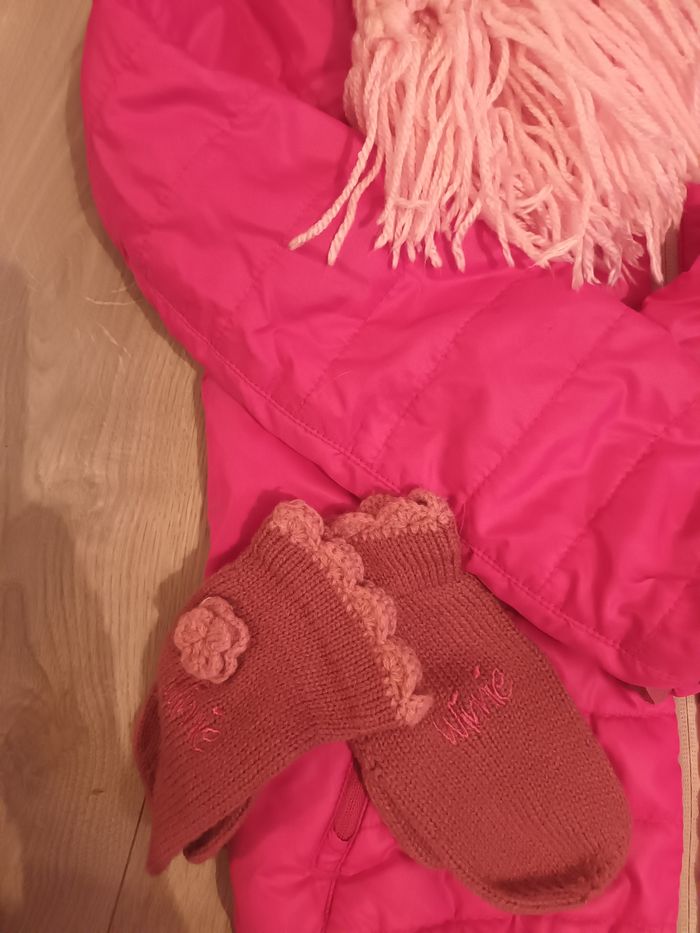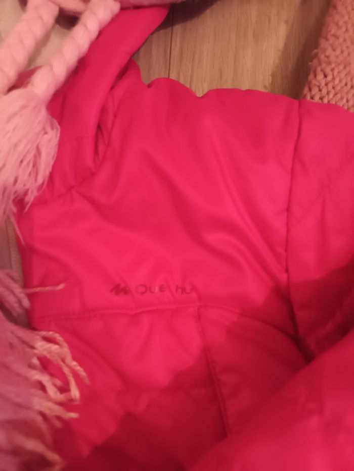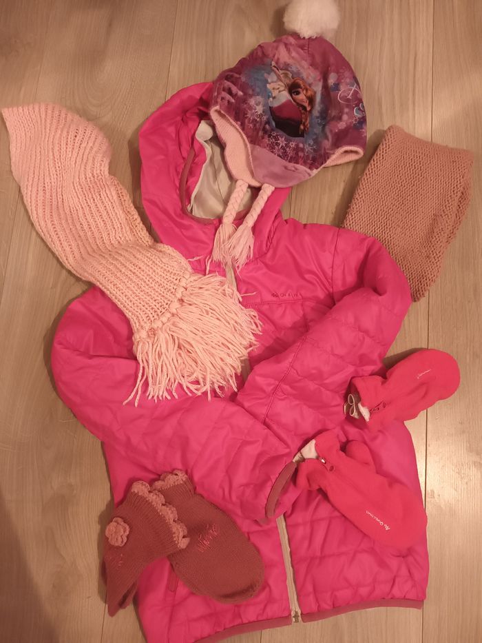 Lot veste quechua fille 2 paires de moufles 1 écharpe faite main rose 1 tour de cou 1 bonnet reine ses neiges