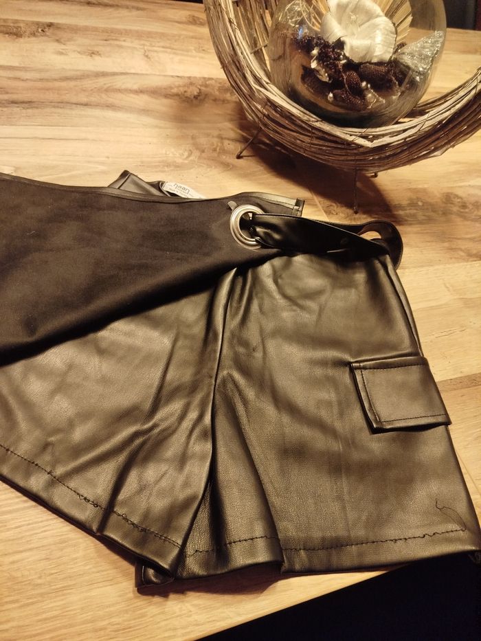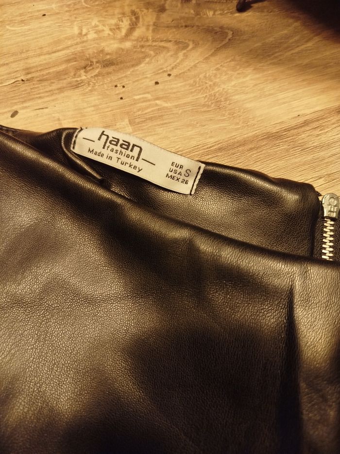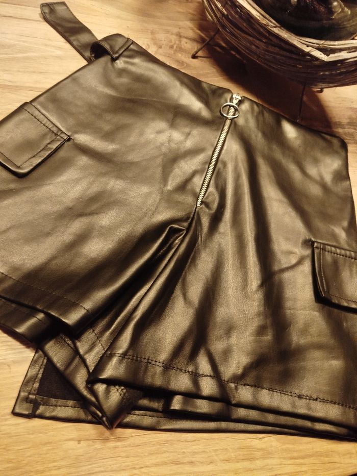 Vends jupe short en simili cuir noir.Fermeture éclair sur le derrière Très peu porté. Taille S Marque : Haan