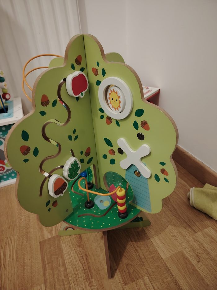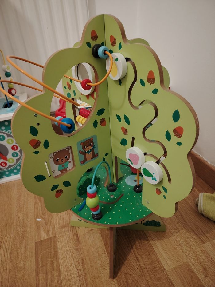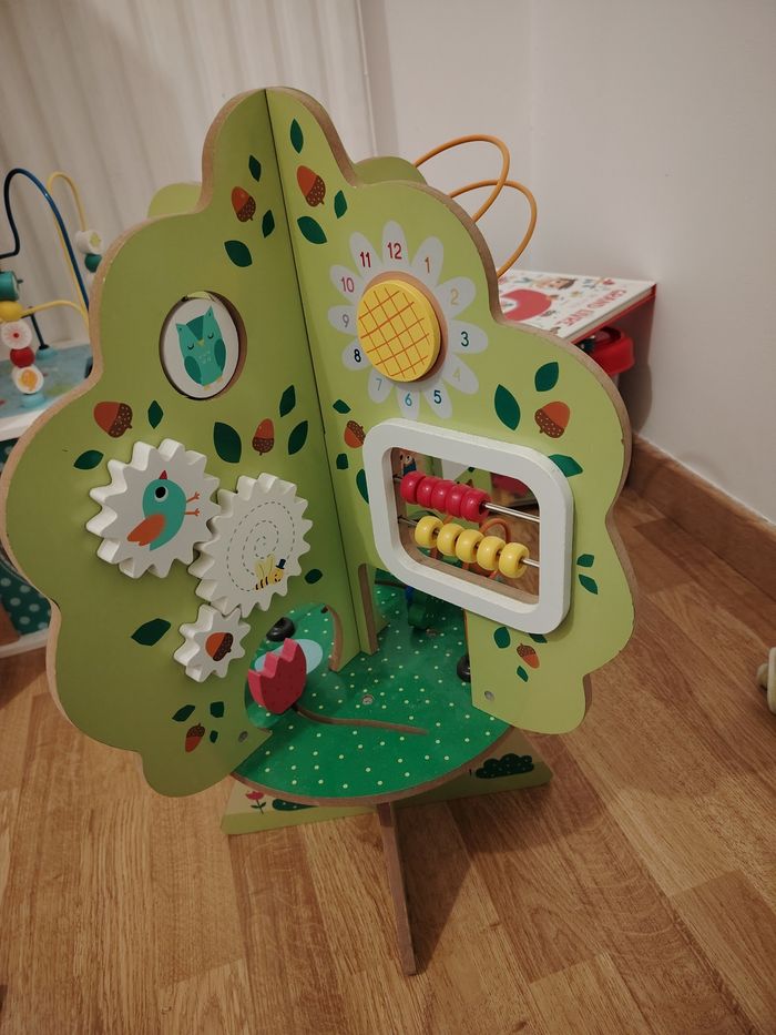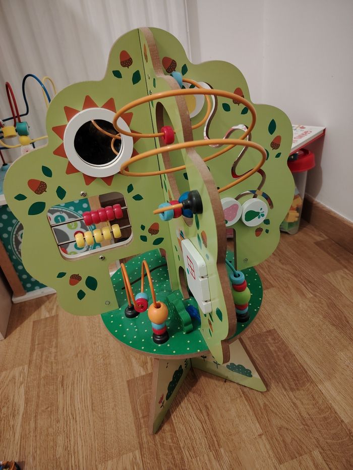 Arbre d'activités en bois, comprenant plusieurs faces avec différents bouliers, ai'si que d'autres activités pour développer la motricité et la découverte de l'enfant