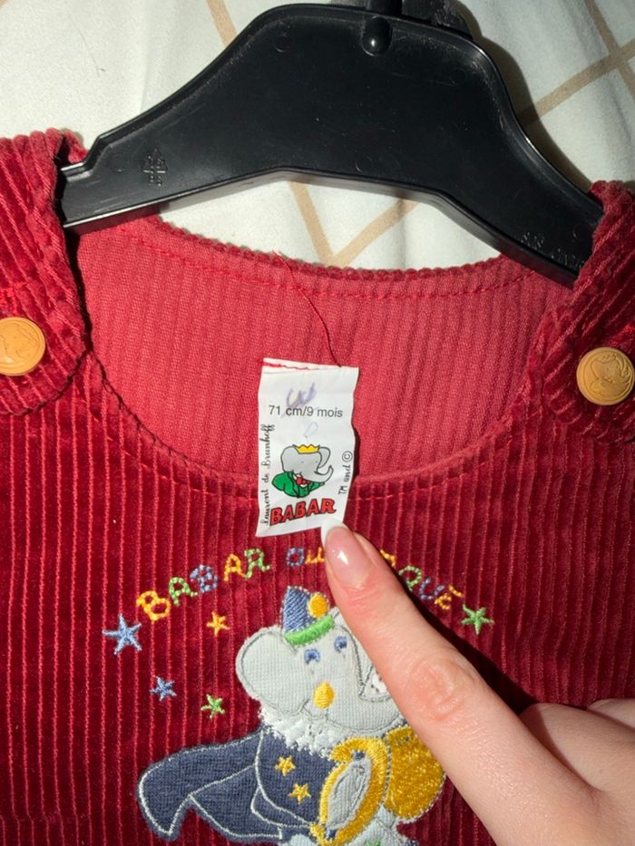 En velours, 85% coton et 15%polyester, lavage 40 degrés, taille 9 mois, très bon état