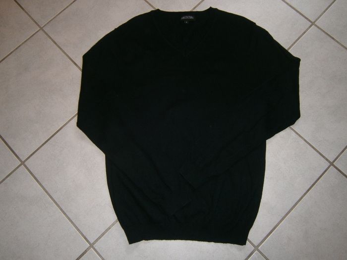 Pull à manches longues. Marque ATELIERS DES CREATEURS. Couleur noir. Col V. Composition : 92% coton, 8% cachemire. Dimensions : Epaule/épaule = 45,50 cm. Aisselle/aisselle = 48 cm. Epaule/bas = 68 cm. Taille S.