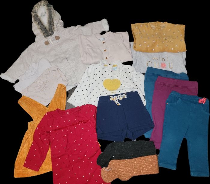 3 x pyjama hiver 3 x pantalon 1 x ensemble haut + short 2 x body manches longues 2 x robe avec collant 1 x manteau