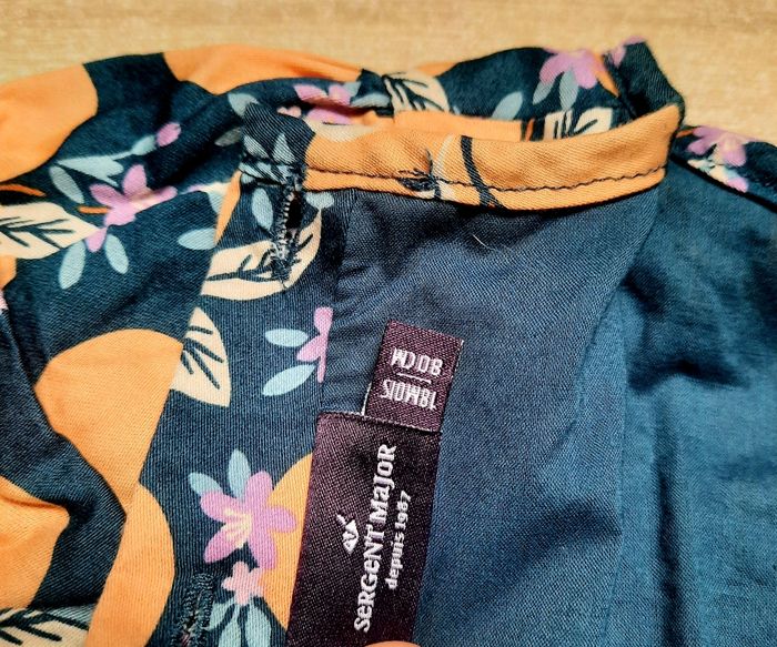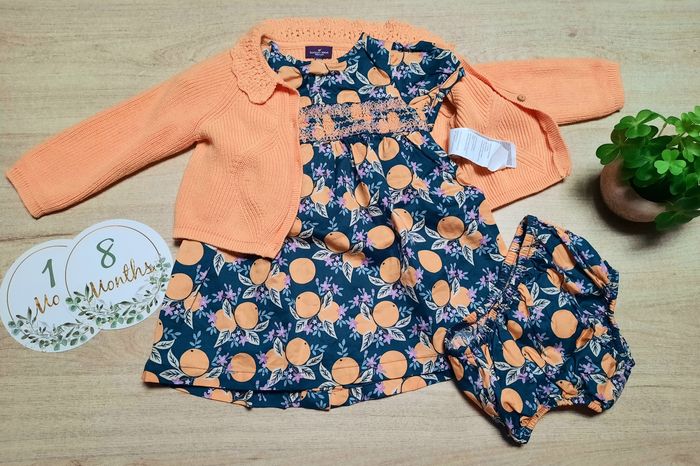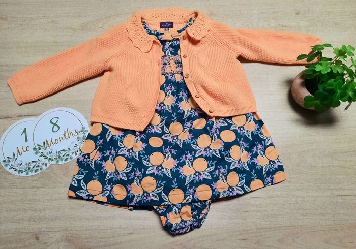 Très beau ensemble de chez Sergent Major taille 18mois Collection printemps-été 2023 Très bon état 🌸 robe courte doublé imprimée orange et fleurs violettes sur fond bleu, manches courtes balon, ouverture intégrale arrière par boutons fantaisie 18mois 🌸 Bloomer élastique assorti imprimer orange et fleurs violettes sur fond bleu 18mois 🌸 gilet en laine orange col claudine du même thème 18mois #auroretltbebefille18mois Réductions actives 💯