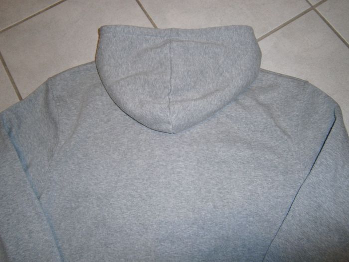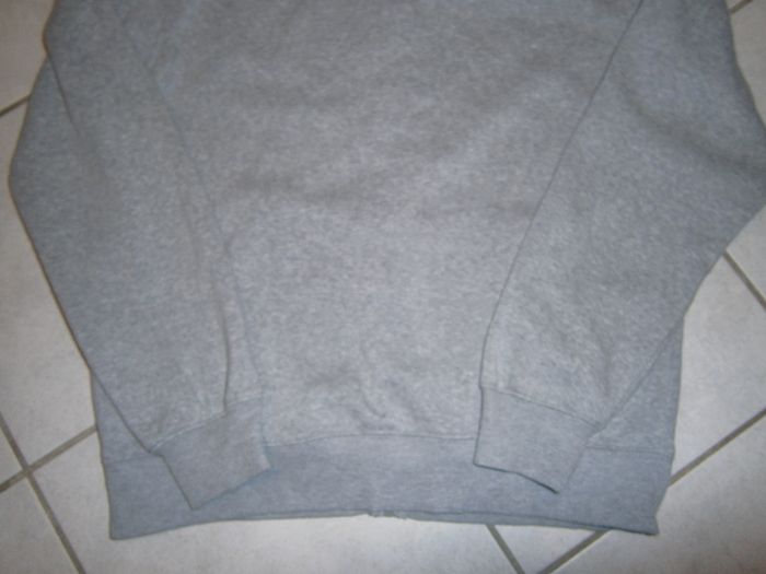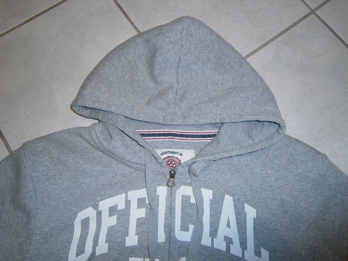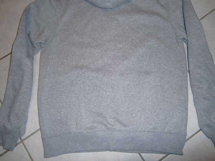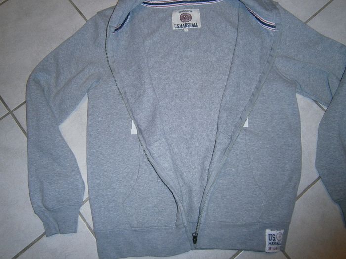 Sweat à capuche et à manches longues. Fermeture éclair devant. Marque U.S. MARSHALL. Couleur gris. 2 poches devant. 100% coton. Dimensions : Epaule/épaule = 51 cm. Aisselle/aisselle = 54cm. Epaule/bas = 68 cm. Taille L.