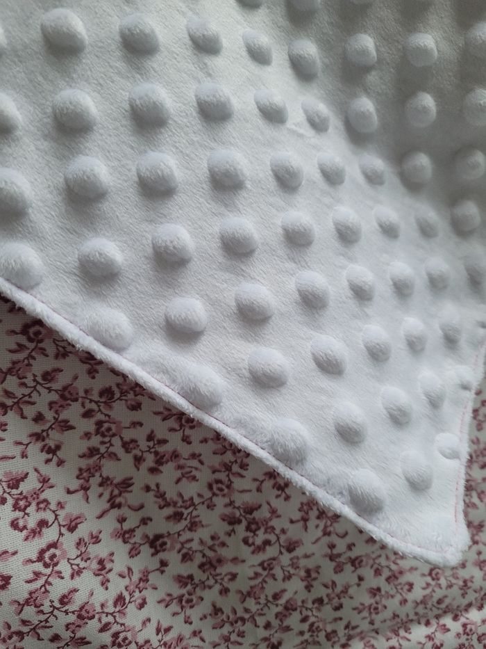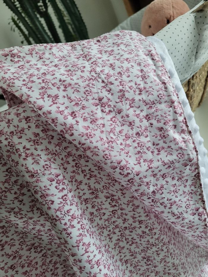 Couverture bébé Tissus: Minky blanc Coton motifs liberty rose Dimensions: 70x70 cm Convient pour automne et printemps, et pour les nouveaux nés convient très bien en été ! Fait main