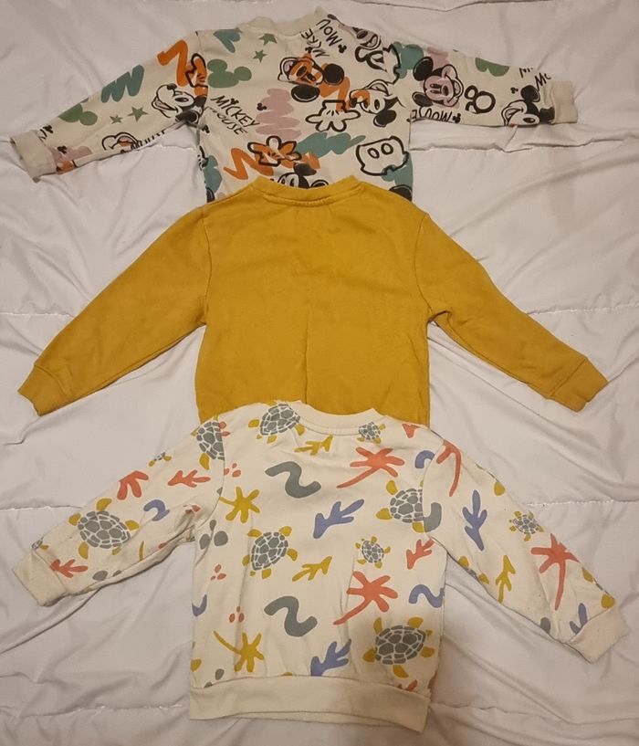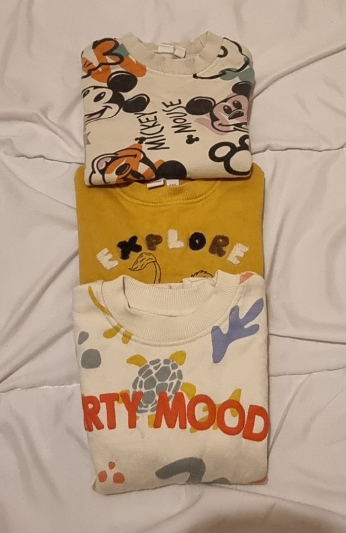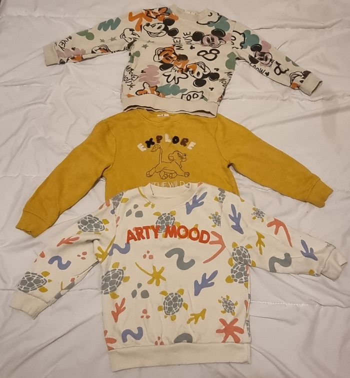 3 pulls garçon. Taille 4 ans. Très bon état ( légères tâches sur la manche du mickey, voir photo).