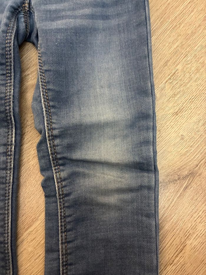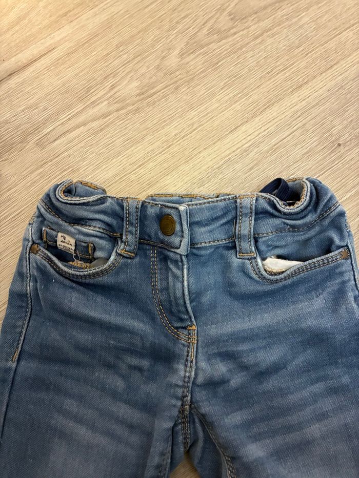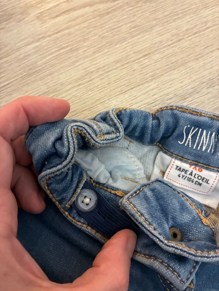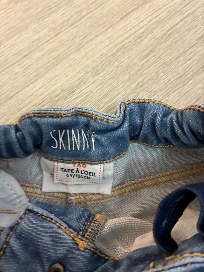 Pantalon jean skinny, taille ajustable. Légèrement blanchi au niveau des genoux. Taille : 4 ans, 104 cm. Marque : Tape à l’œil.