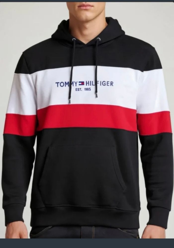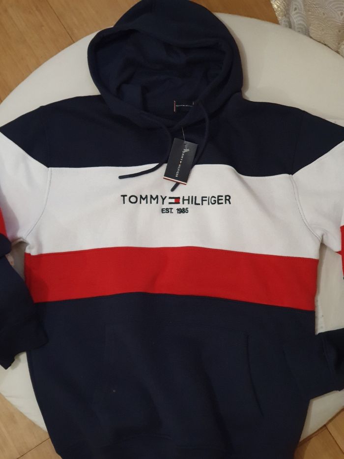 Pull Tommy Hilfiger avec capuche et poches couleur en bleue blanc rouge Taille XL #pull #tommyhilfiger #sweat #sweattommyhilfiger #pullacapuche #pascher #neuf