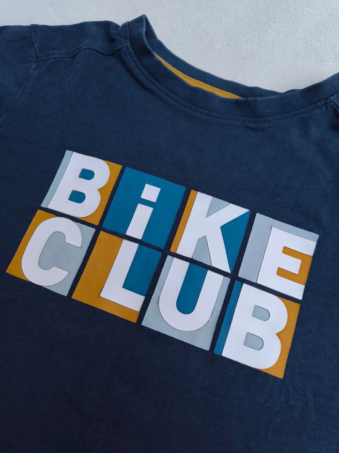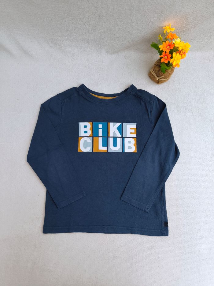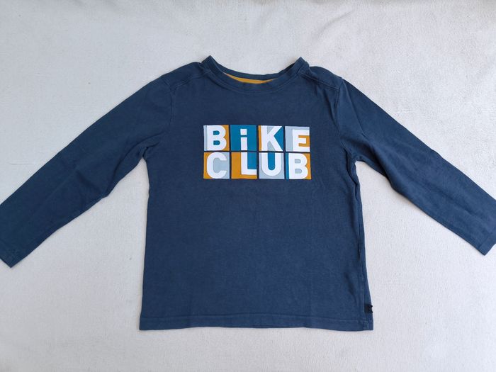 T-shirt à manches longues Marque Okaïdi Taille 6 ans, 116 cm • Coloris marine, blanc, moutarde • Inscription "Bike club" • Coton fin • Inscription légèrement craquelé En très bon état #evelyne_garcons_6ans #evelyne_garcons