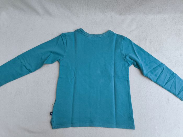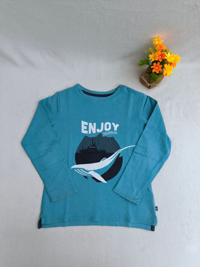 T-shirt à manches longues Marque Okaïdi Taille 6 ans, 116 cm • Coloris bleu, marine, blanc • Inscription "Enjoy the open sea", imprimés baleine, bateau • Coton fin • Imprimé légèrement craquelé, bas des manches légèrement marronnés/taché En très bon état #evelyne_garcons_6ans #evelyne_garcons