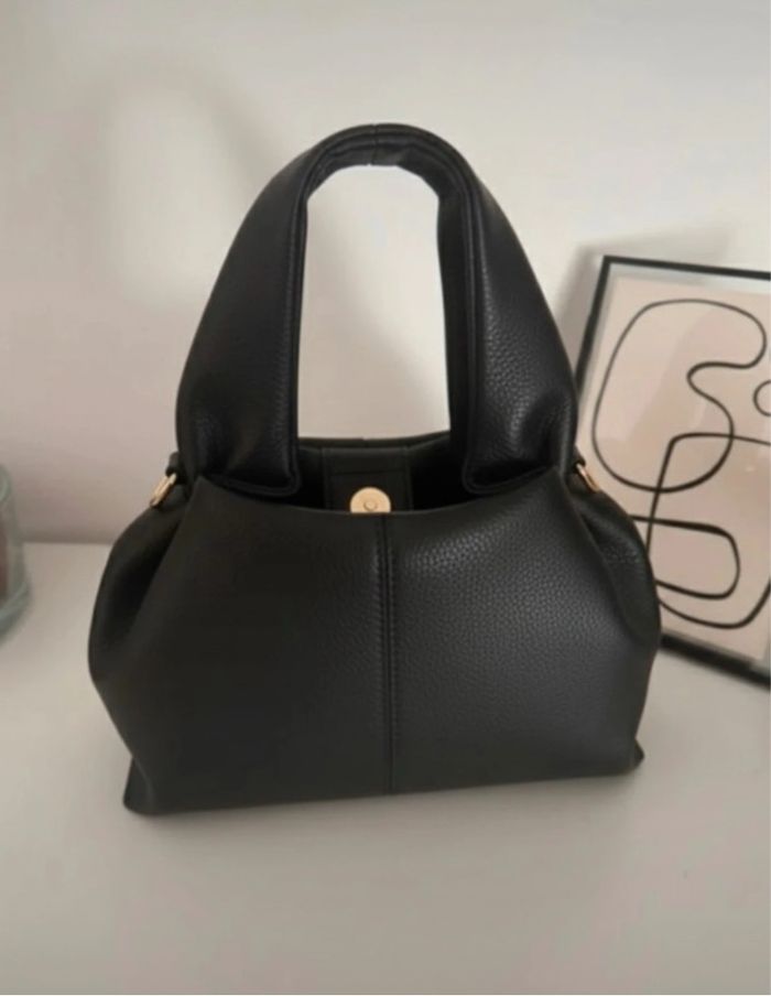 Elégant sac à main en simili cuir noir grainé avec forme arrondie et structurée inspiré de grande marque de luxe. Anse et bandoulière pour porter à l'épaule ou à la main, fermeture magnétique avec patte centrale et détail doré discret. Design minimaliste et intemporel avec base large et stable, intérieur spacieux pour vos essentiels quotidiens. Accessoire chic et polyvalent qui s'accorde avec toutes les tenues. 25*15cm