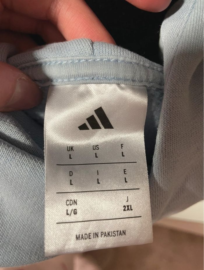 Pull à capuche Adidas en taille L. La couleur sur les images a l’air plus ternes qu’en vrai, la couleur du pull est bleu clair. Article neuf sans étiquette.