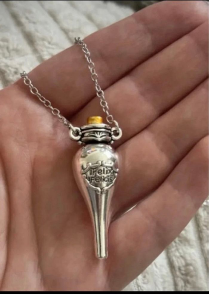 DRESSING PROPOSANT RÉDUCTIONS 💶😀 Collier représentant une fiole de Félix FELICIS : De la chance liquide, de la célèbre saga Harry POTTER. Couleur : Argenté DIMENSIONS : 4,5 cms de hauteur ✨NEUF. Jamais servi.✨ Prix : 5€99 Je dépose DANS LA MESURE DU POSSIBLE les colis 📦 le lendemain du paiement. 😉 MAIS SI CEST UN ENVOI URGENT, MERCI DE ME LE PRÉCISER ☺️. N’hésitez pas à jeter un coup d’👀 à mes évaluations. 🙂