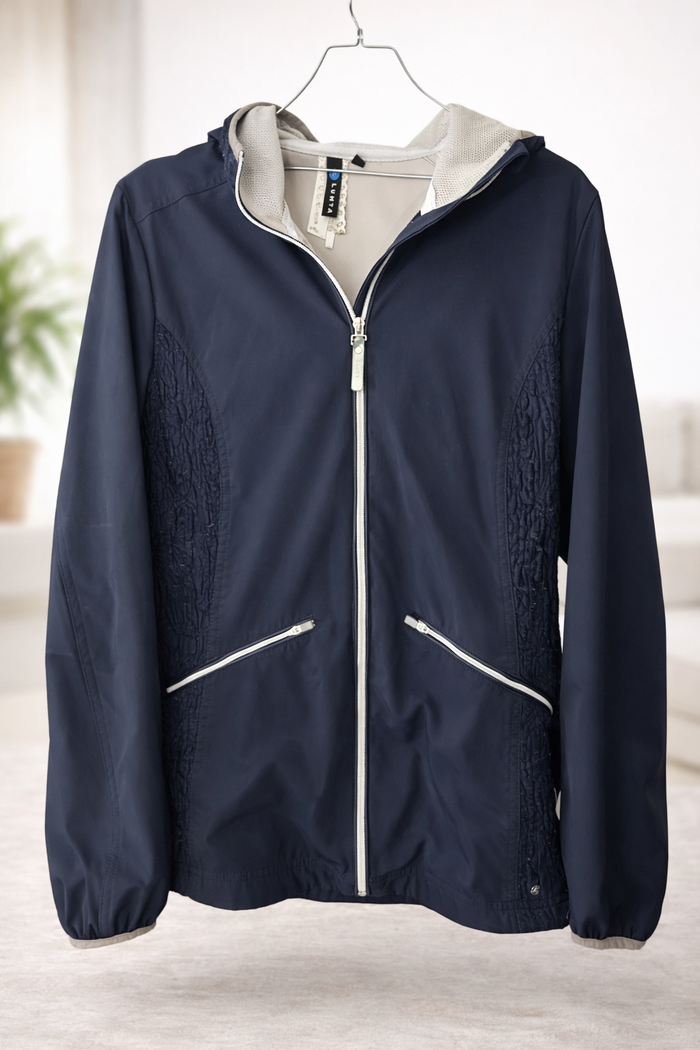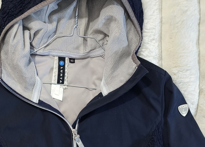 🧥 Veste coupe-vent LUHTA femme – Taille 40 (L) Très jolie veste coupe-vent légère de la marque LUHTA (marque reconnue de vêtements outdoor), idéale pour la mi-saison. Couleur bleu marine élégante avec empiècements texturés sur les côtés et la capuche. Capuche intégrée, fermeture zippée, poches zippées. Intérieur en maille respirante, confortable et pratique pour un usage quotidien, la marche ou les activités sportives. Coupe féminine, moderne et facile à porter. 📏 Mesures à plat : - Aisselle à aisselle : 49 cm - Longueur (haut/bas) : 64 cm