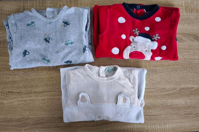Lot de 3 pyjamas en très bon état J'en donne un en plus car petit trou au niveau d'une pression. En très bon état. Taille : 24 mois