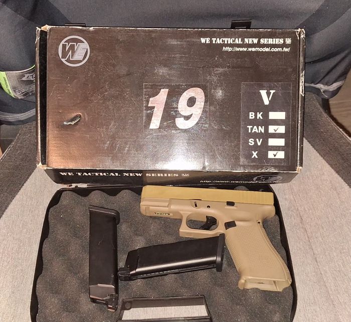 Réplique d'airsoft type glock 19 de WE avec deux chargeur a gaz boîte d'origine et mallette de transport