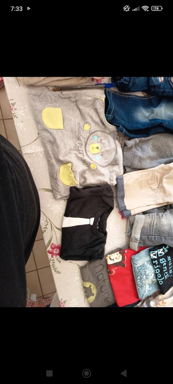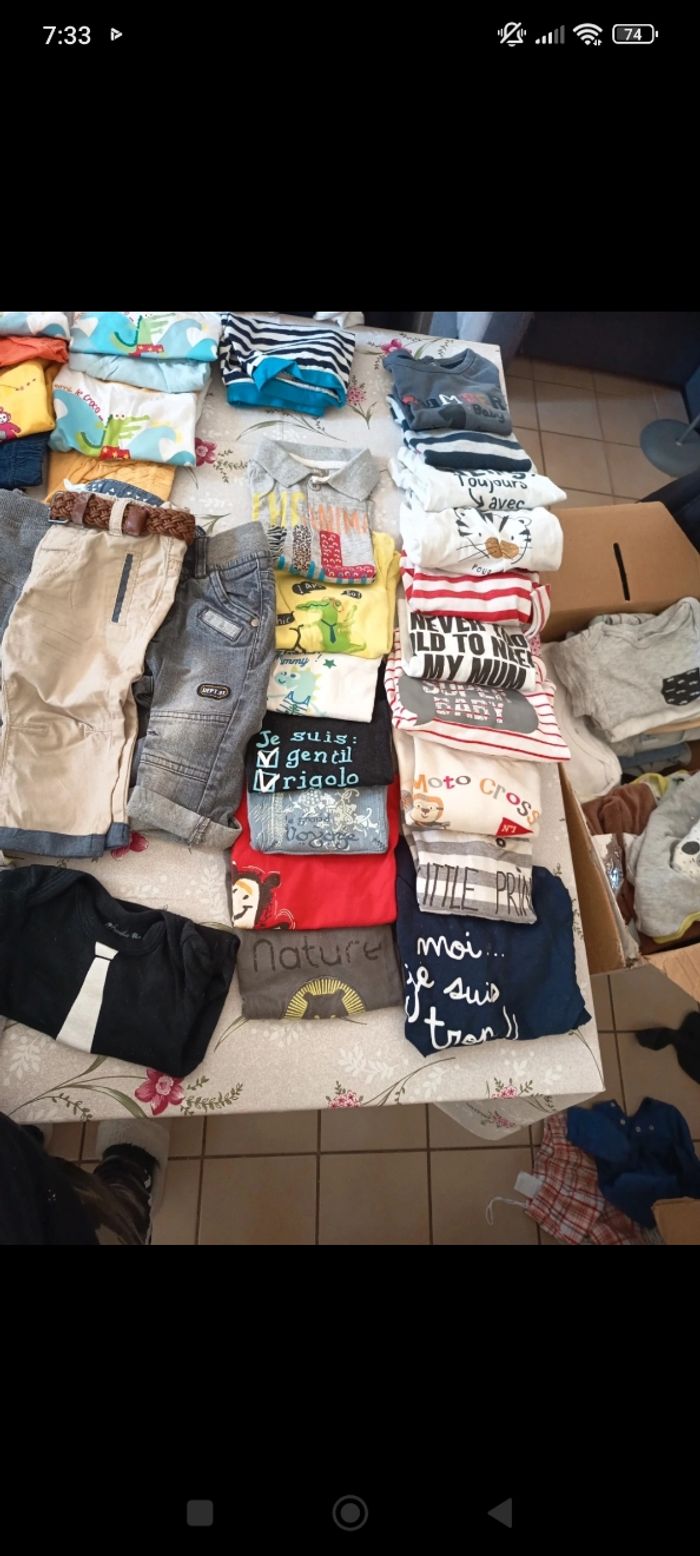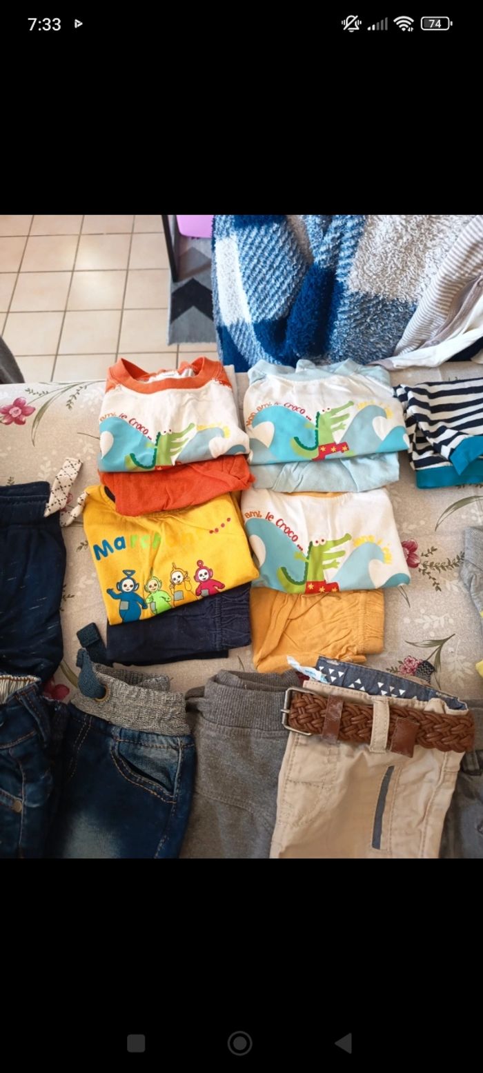 38bodie 4jeans 1joggins 2short 4ensemble 10haut manche longue 7tee shirt 2combi habiller 2veste a fermeture 1chemise 10pyjama Tout en parfaite état envoi rapide je jour même de commande