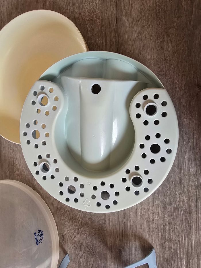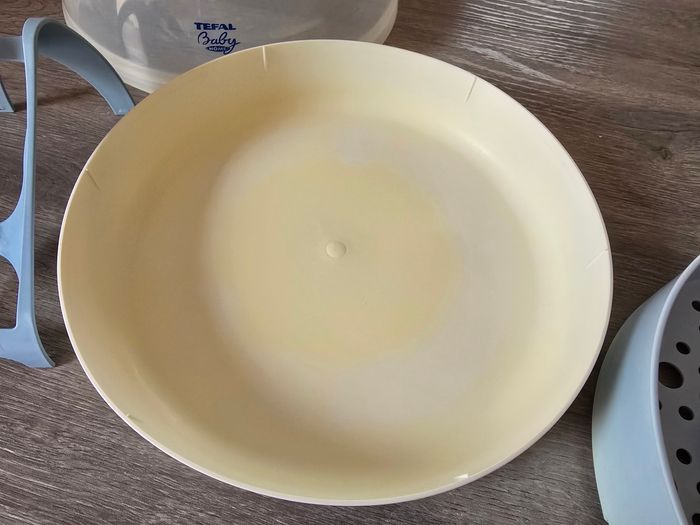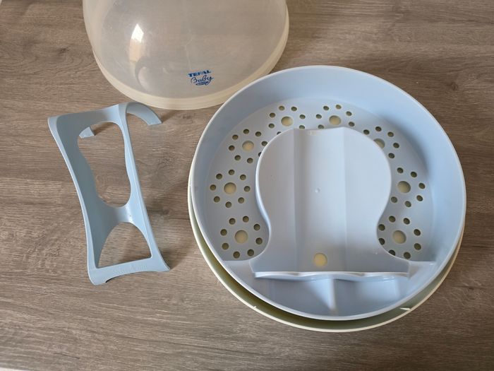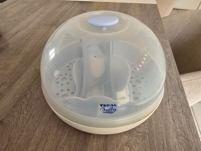 Sterilisateur biberon Tefal, en bon état. C'est un sterilisateur sans prise, qui se sert au micro-ondes. Il peut aussi faire office d'égouttoir à biberon et accessoires. Il y a quelques traces d'usures (il a un peu jaunis sur le support blanc) mais ne gêne en rien à son utilisation. Il y a également un support à biberon de marque Whirlpool. Tout a été entièrement lavé. 5€, envoi rapide et soigné.