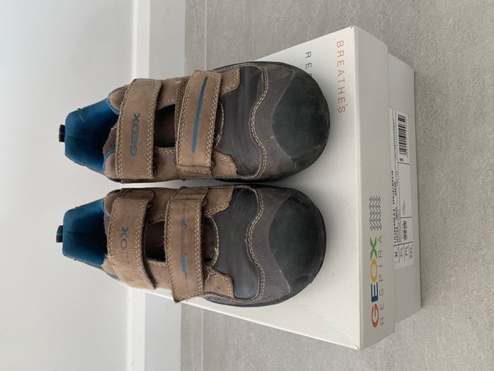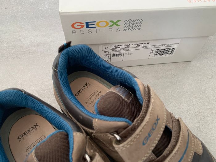 Chaussures garçon basket à scratch avec boite marque GEOX modèle Savage marron pointure 35 Acheté 65€ Très bonne qualité Semelle respirante antibactérienne en cuir sans chrome atoxique, pour un confort et une sensation de pieds au sec constants. Les renforts sur le bout et le talon protègent les pieds contre les chocs et les impacts.