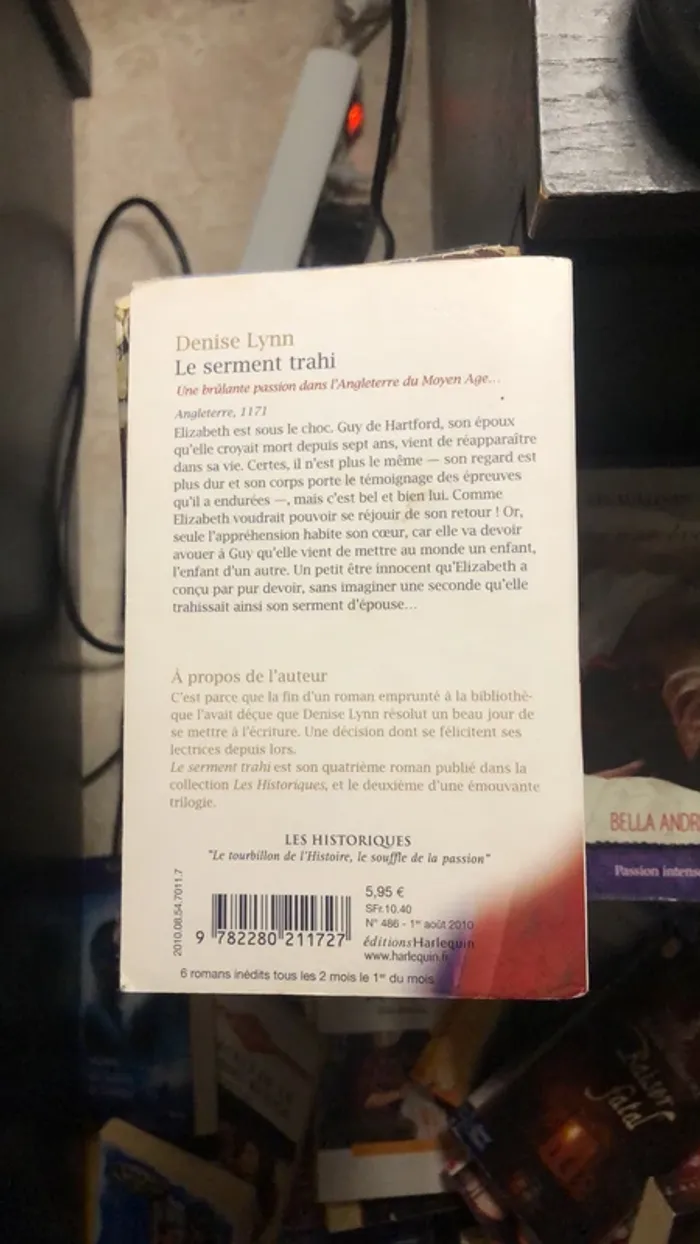 Plongez au cœur d’une romance historique intense et passionnée dans l’Angleterre du Moyen Âge. Le Serment Trahi est un roman captivant mêlant amour, trahison et secrets, porté par des personnages forts et une intrigue émouvante. 🔹 Collection : Les Chevaliers de la Couronne 🔹 Genre : Romance historique 🔹 Éditeur : Harlequin 🔹 État : Neuf, jamais lu (voir photos) Idéal pour les amateurs de romances historiques, ou pour compléter une collection Harlequin.