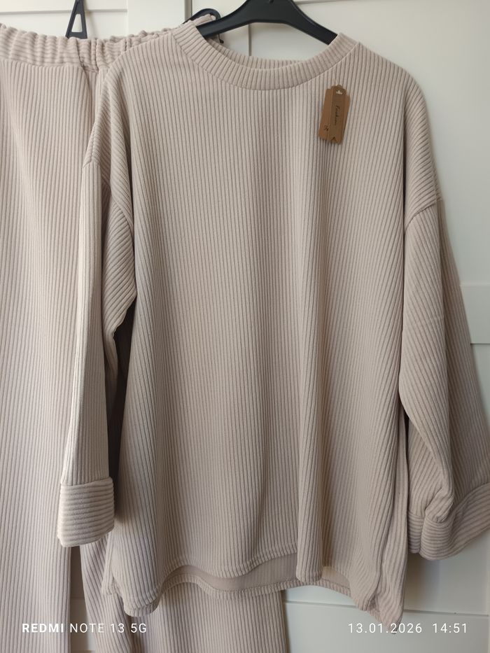 Taille : xl • État : Neuf, jamais porté avec étiquettes • Couleur : beige • Matière : agréable à porter • Style : Parfait pour la ville, le travail maison ou les sorties Magnifique ensemble deux-pièces en matière velours côtelée, idéal pour un look chic et confortable. Le haut ample met la silhouette en valeur, et le pantalon à coupe large apporte une allure élégante et moderne.