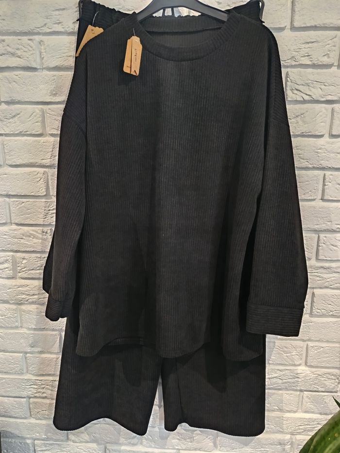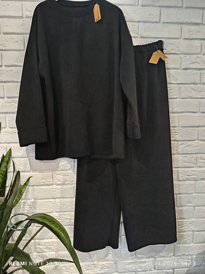 Taille : xl • État : Neuf, jamais porté avec étiquettes • Couleur : noir • Matière : agréable à porter • Style : Parfait pour la ville, le travail maison ou les sorties Envoi rapide 📦 Magnifique ensemble deux-pièces en matière velours côtelée, idéal pour un look chic et confortable. Le haut ample met la silhouette en valeur, et le pantalon à coupe large apporte une allure élégante et moderne.