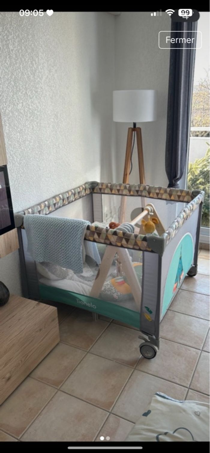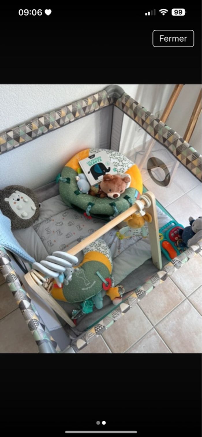 Vend parc en très bon état général hormis deux trous voir photo. Celui dans le fond du parc est en dessous du matelas ce qui ne pose aucun problème. Vendu avec la housse de transport ainsi que 4 poignets pour aider au lèver de l’enfant