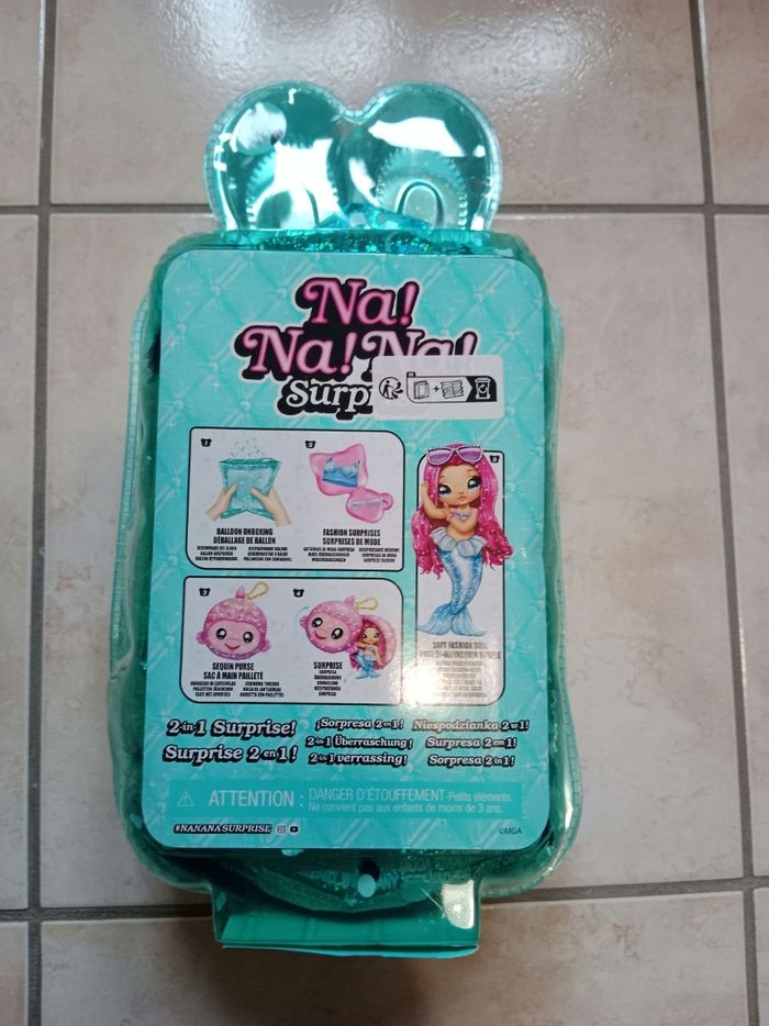 Poupée Na! Na! Na! Surprise sirène. Neuve dans sa boîte. La boîte est abîmée sur un côté (cassée, un trou sur le côté, voir les 3e et 4e photos), mais la poupée est neuve dans son emballage.