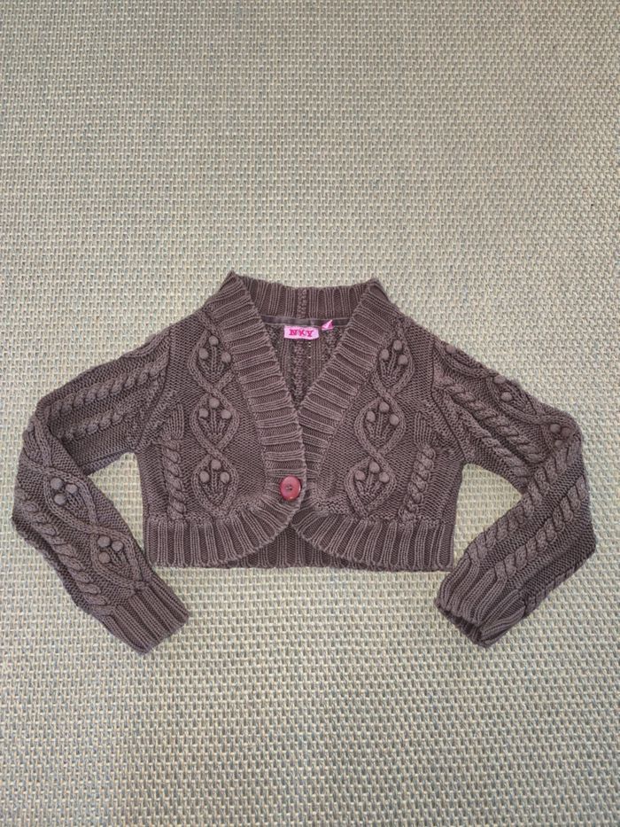 Boléro fille NKY , 8 ans , coloris marron , longueur totale 31 cm , aisselle à aisselle 35 cm , très bon état . N'hésitez pas à me demander d'autres photos ou infos complémentaires et à consulter mes autres ventes .