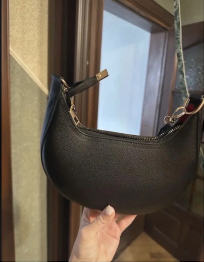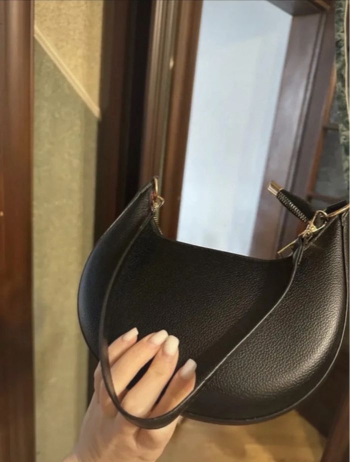 Sac à main en simili cuir rigide, finition lisse. Forme arrondie et fermeture zippée sur le dessus. Poignée courte renforcée par des attaches dorées. Taille compacte, suffisante pour contenir téléphone, portefeuille et petits accessoires. Couleur : Noir État : Neuf