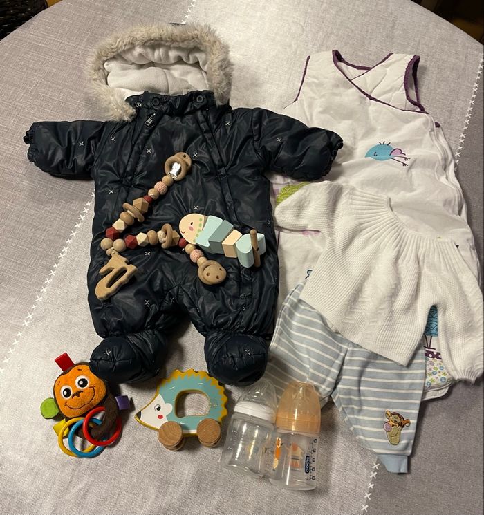 Ce lot comprend : 1 Gigoteuse 1 Combi pilote marine 1 lot brassière et pantalon molletonné 2 petits biberons tétines neuves Lot de 3 bavoirs bandanas Lot de 5 bavoirs bandanas gaze de coton Lot de 3 jouets bois et peluche singe Plus de remise sur ce lot