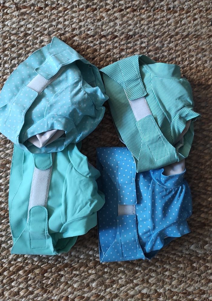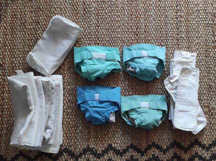 Lot de 4 couches hamac + insert: - 4 couches hamac élastiques en parfait état légère trace jaune de selles sur élastiques - 2 inserts coton - 6 inserts microfibre - 1 insert nuit - 2 boosters Routine en 2 cycles Les couches ont peu servi car gros bébé.