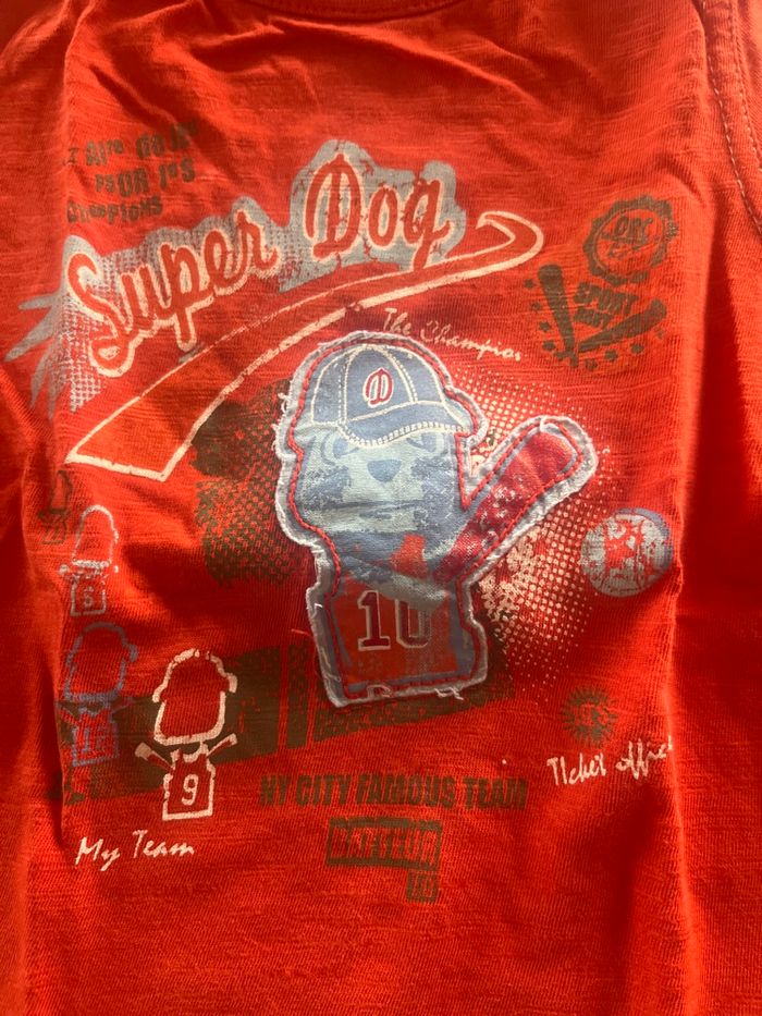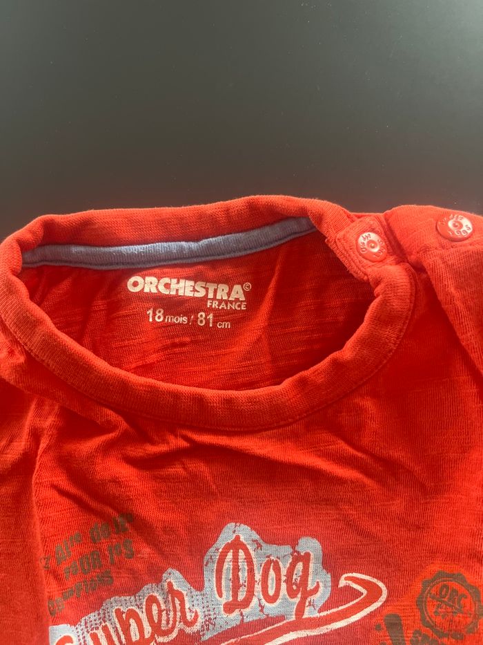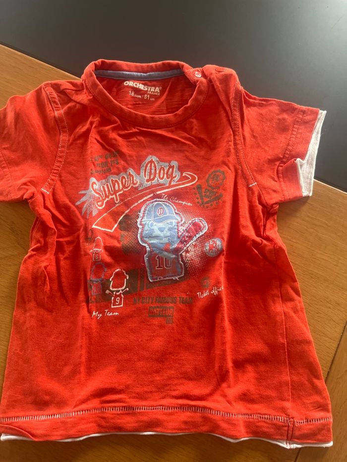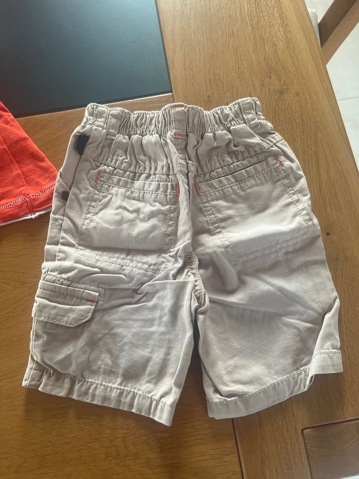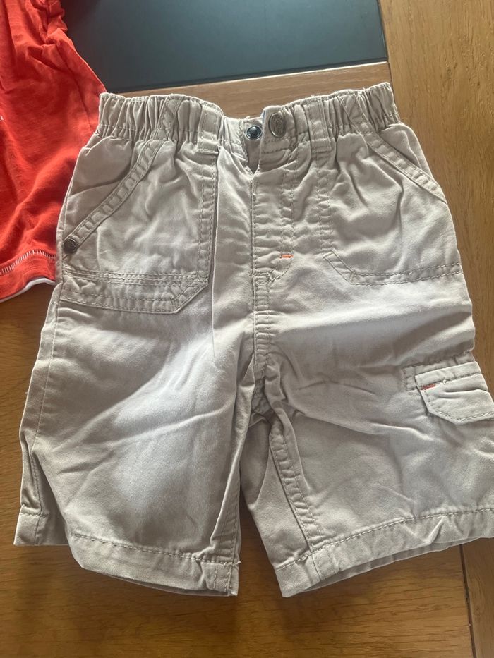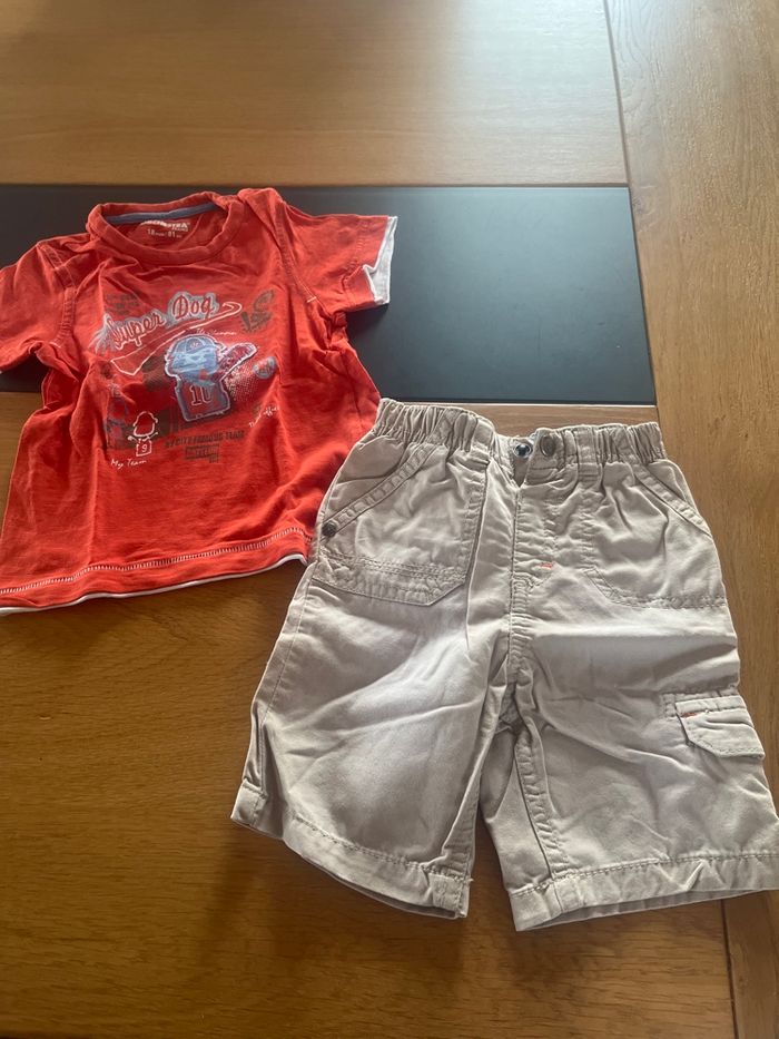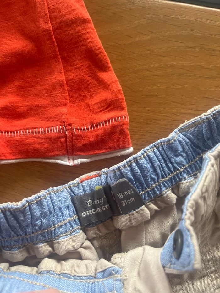 Ensemble garçon tee-shirts et short le tout en 18mois(81cm) en très bon état. Détails sympa sur le tee-shirt avec l’effet double teeshirt et sur le short avec une petite poche sur le côté. Le teeshirt est orange et blanc avec un motif sur le devant et le short est beige avec bouton pression et ceinture élastique Le tout en très bon état voir photo