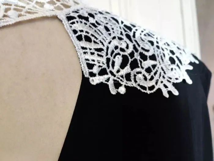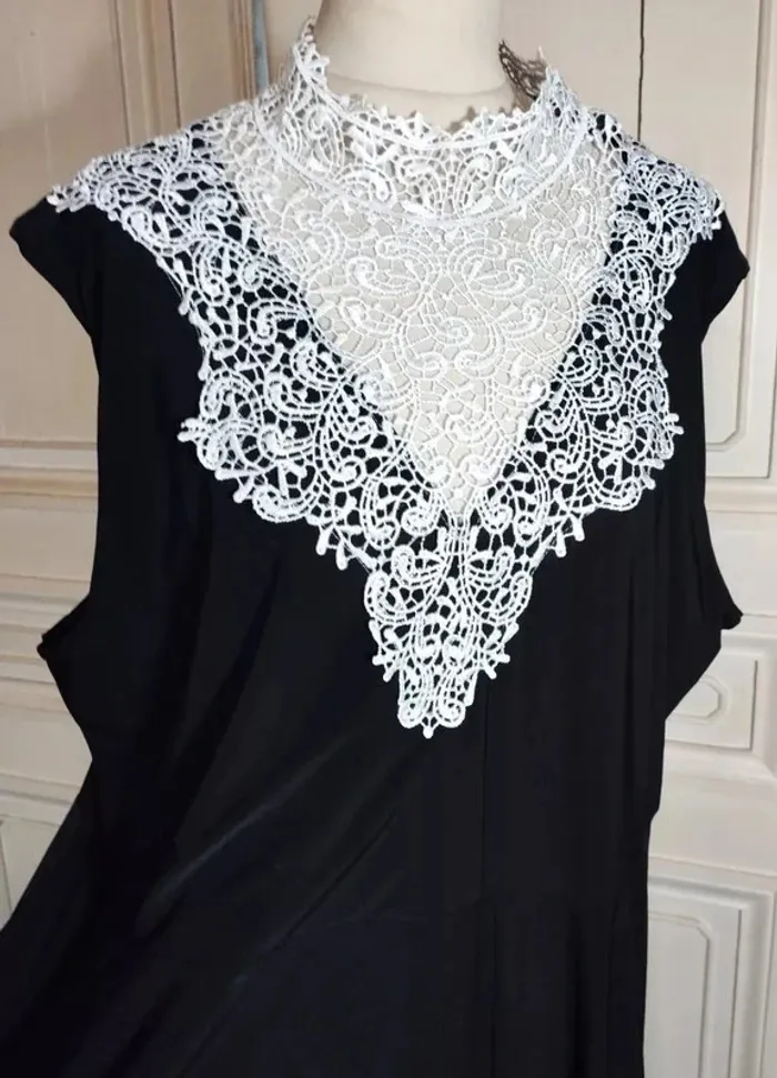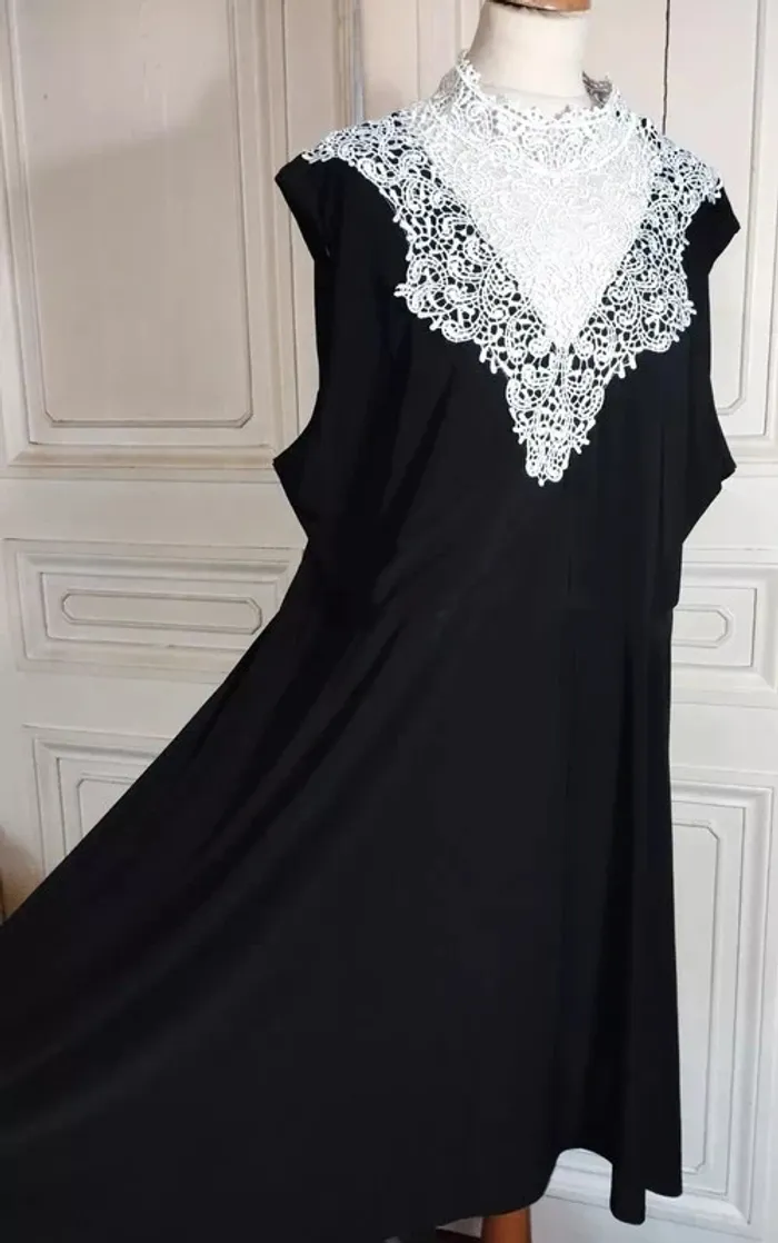 PRASLIN ROBE SOIREE T UK 26 CORRESPOND A UN 56/58 VOIR MESURES DETAILLEES AU BAS MODELE SOIREE ELEGANT ET ULTRA FEMININ CONFORTABLE BIEN EXTENSIBLE TISSU PROCHE JERSEY SATINé NOIR INTENSE SEMI LOURD TOMBé IMPECCABLE PLASTRON DE DENTELLE BLANCHE SEMI RIGIDE ET AJOURéE DE 41 CM SUR 37 NON DOUBLéE JOUANT DES TRANSPARENCE SUR LE DECOLLETTé AVEC DEPART EN COL TOUR DE COU 24 CM DE LARGEUR FERMé SUR LA NUQUE PAR 2 BOUTONS NACRES BOMBéS CREME ET DESCENTE EN PLASTRON VERS LE CREUX DECOLLETTé SUR UNE OUVERTURE INCISE DE 14 CM DE LARGE ET 19 CM DE PROFONDEUR ENMANCHURES CONFORTABLES 34 CM TAILLE MARQUEE PAR DECOUPE OUVRANT SUR UNE DECOUPE JUPE EN COROLLE DESSINANT DE JOLIS PLIS DANSANTS ET DONNANT AU BAS UNE AMPLITUDE DE 340 CM OUVERTURE AU HAUT DU DOS 13 CM SUR 18 SOUS LA NUQUE INFROISSABLE TENUE IMPECCABLE 95% POLYESTER 5% ELASTHANE MESURES PRISES A PLAT PUIS EN ETIRANT RAISONNABLEMENT EPAULES 50 A 54 CM POITRINE 64 A 70 CM TAILLE 62 A 67 CM BAS 170 CM AMPLITUDE 340 CM LONGUEUR 100 CM