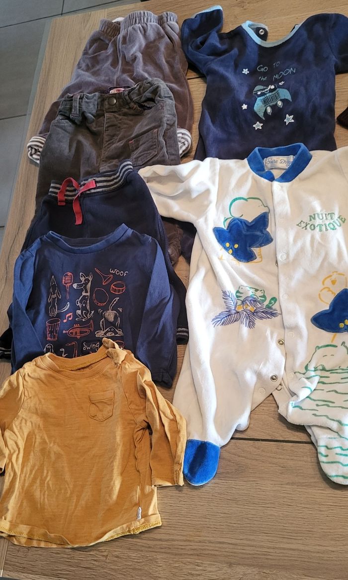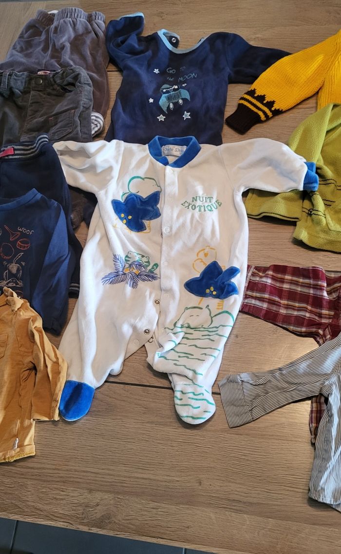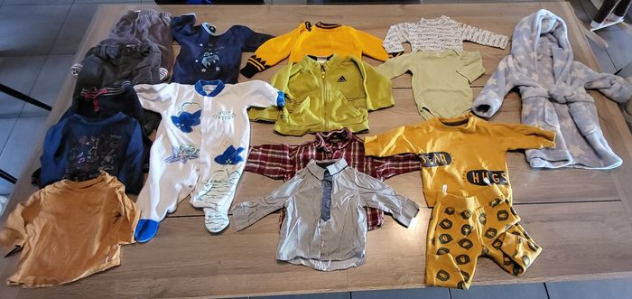En trés bon état lot 6 mois garçon hiver de différentes marques ( timbaland , adidas, kiabi ...) Ce lot comprend 2 pyjama 1 piéce et 1 pantalon de pyjama , 1 pantalon, 1 jogging, 2 haut manches longues, 1 pull en laine et 1 gilet , 2 chemises , 2 bodies , 1 ensemble et 1 peignoir. N'hésitez pas à regarder mon dressing, une réduction peux être appliquée pour les achats en lot, Envoie rapide et soignée 😊☀️