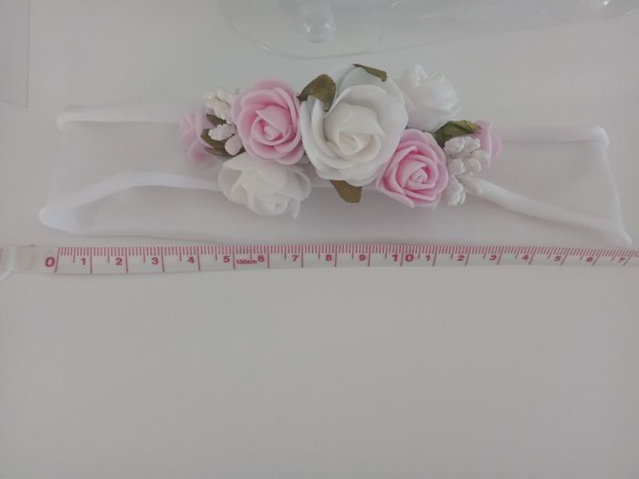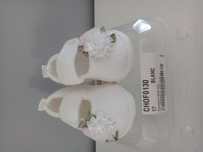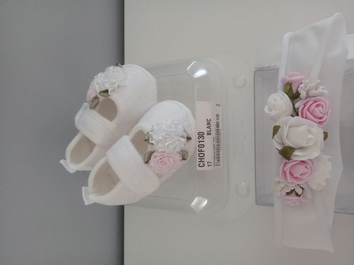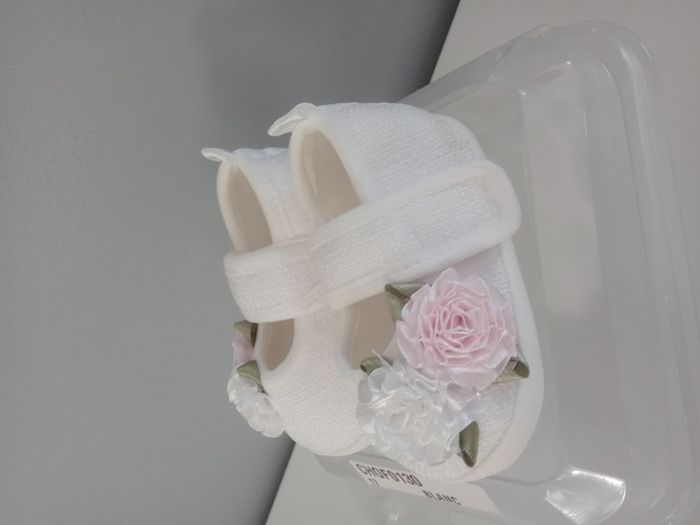 Magnifique ensemble : - chaussons blanc fleuris avec fermeture à scratchs taille 17 - bandeau assorti fleuri, longueur environ 8 cm, matière extensible très douce Marque Sourire d'un ange Neuf