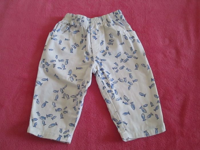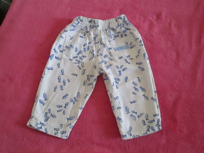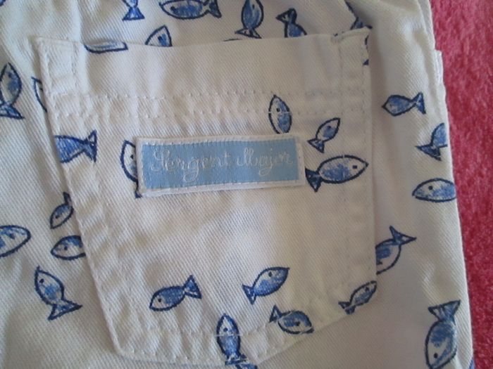 Vends pantalon blanc Sergent Major avec motifs poissons bleus. Taille élastiquée. 100 % coton. Taille 6 mois. Neuf, jamais porté. Pour plus de choix, allez consulter mes autres annonces.