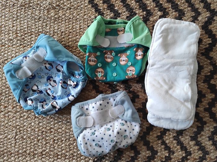 Lot de 3 couches Bumdiapers+ insert de la marque Tille unique de la naissance de à la propreté Bien servi mais élastique et scratch ok Routine en 2 cycles