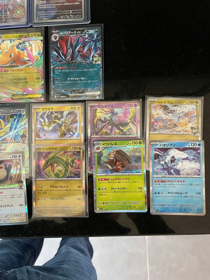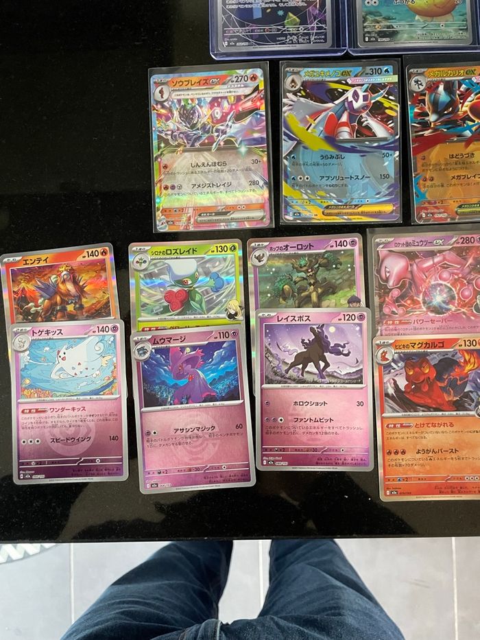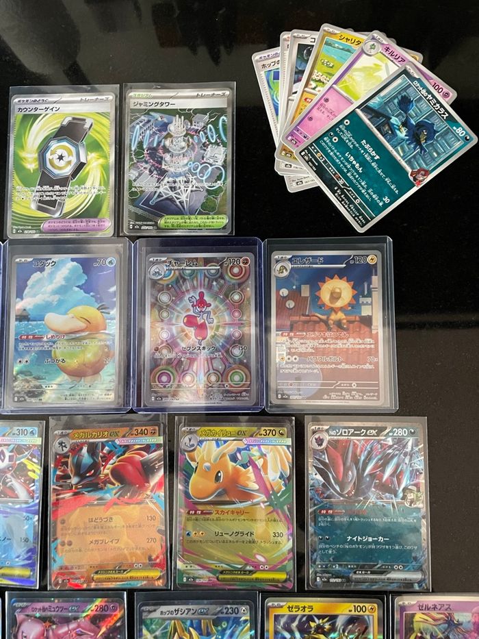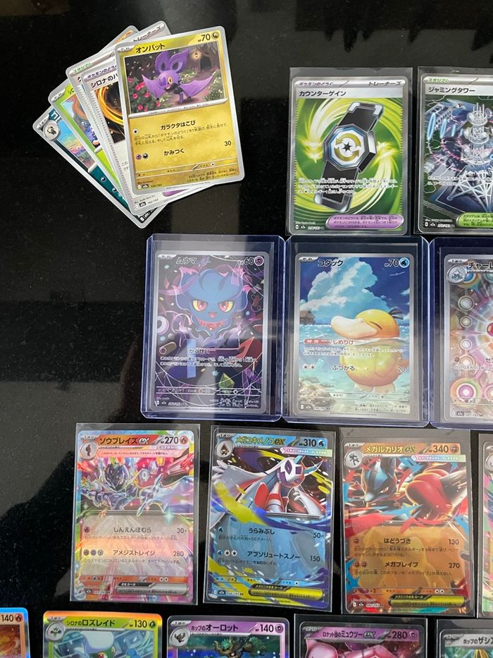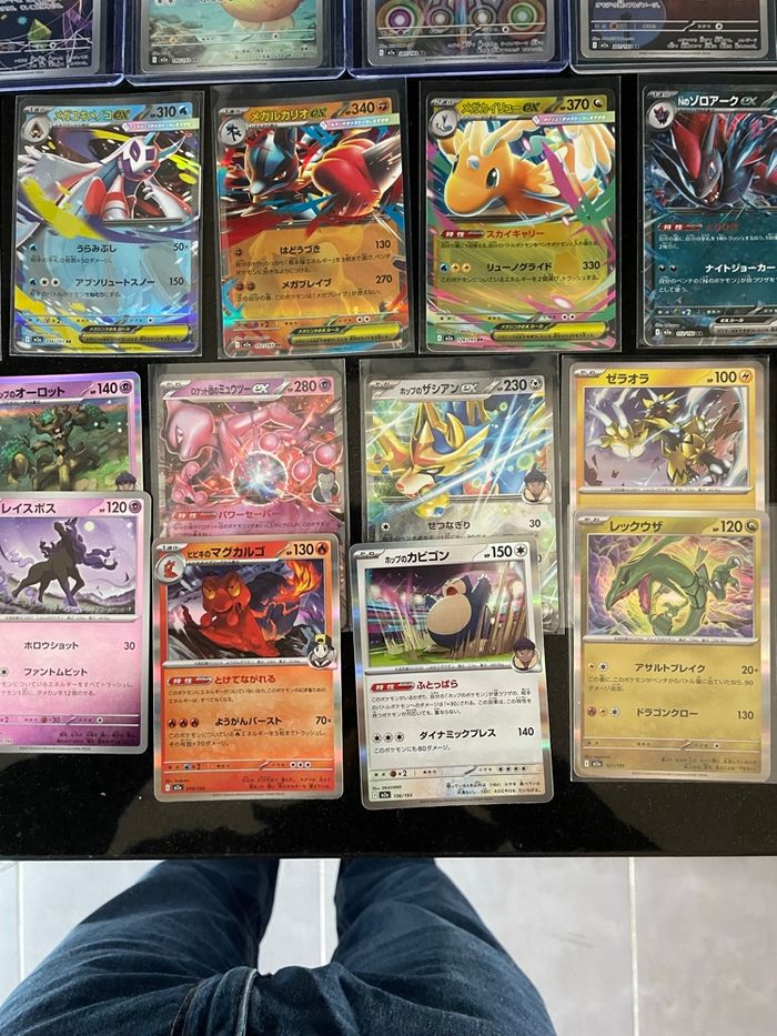 Lot de carte japonaise M2a mega dream ( me2.5 en français) 4 AR / 2 SR / 7 EX / 14 holo reverse / 12 co AR : Psykokwak (m2a 199) 199/193 Iguolta (m2a 201) 201/193 Charmina (m2a 207) 207/193 Feuforêve (m2a 202) 202/193 SR : Tour de Brouillage (m2a 222) Rattrape-Riposte (m2a 218) Ex : Mega Dracolosse ex (m2a 126) Mewtwo ex de la Team Rocket (m2a 063) Mega Lucario ex (m2a 092) Mega Momartik ex (m2a 036) Zoroark ex de N (m2a 112) Malvalame ex (m2a 031) Zacian ex de Nabil (m2a 123) Holo : Ronflex / reshiram / xerneas / rayquaza / zeraora / magireve etc…