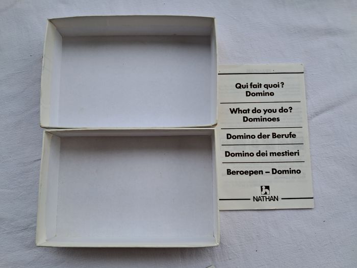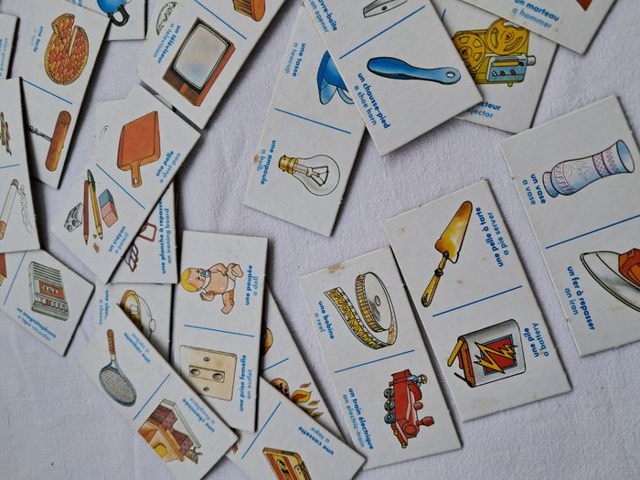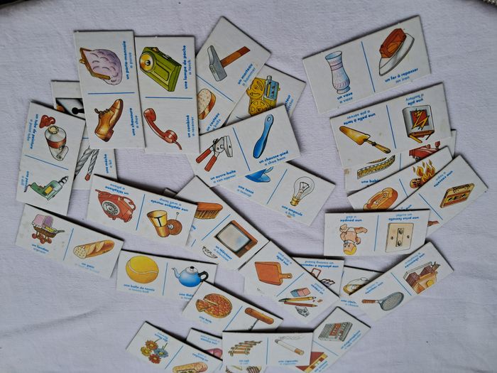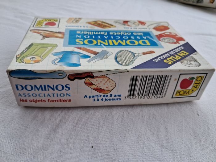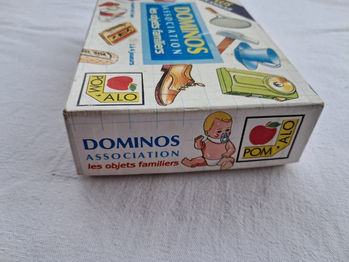 Dominos association les objets familiers pom'alo vintage ancien Pom'alo cric 1990 Jouez en anglais Dès 3 ans Dimensions de la boite : 15 x 10 x 3,5 cm Poids total : 131 grammes Beaucoup utilisés, traces d'usures et du temps, tâches, abimés.... voir les photos Bon état