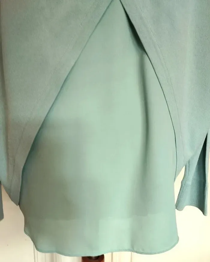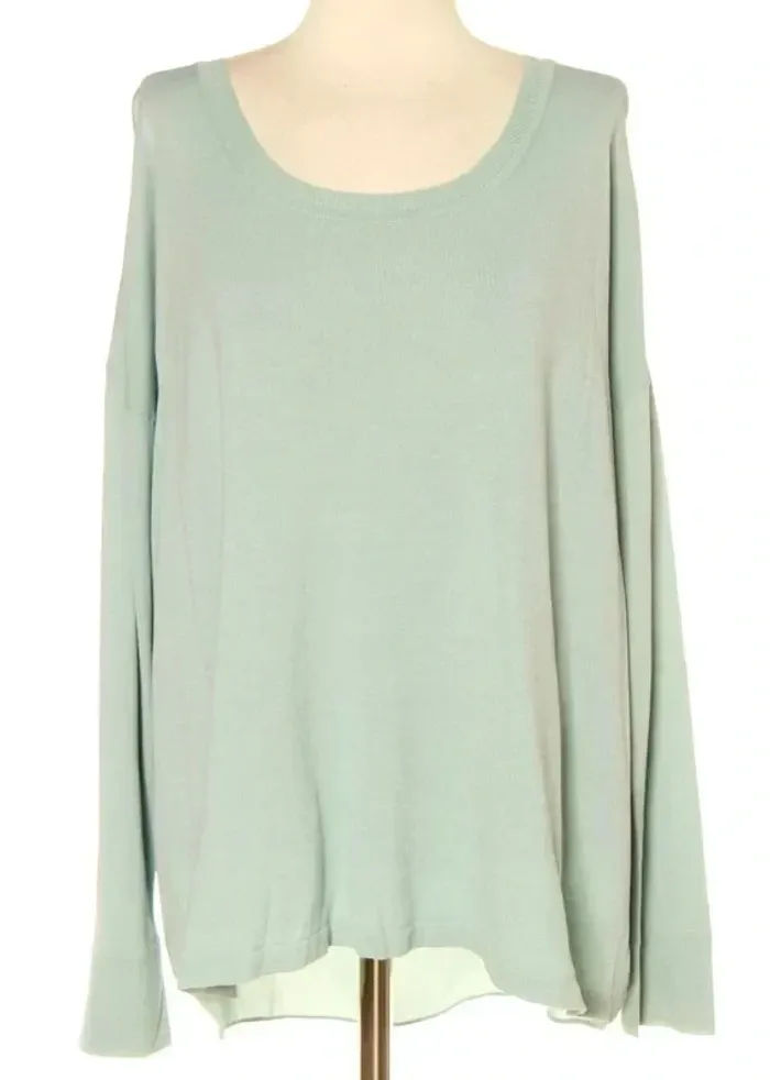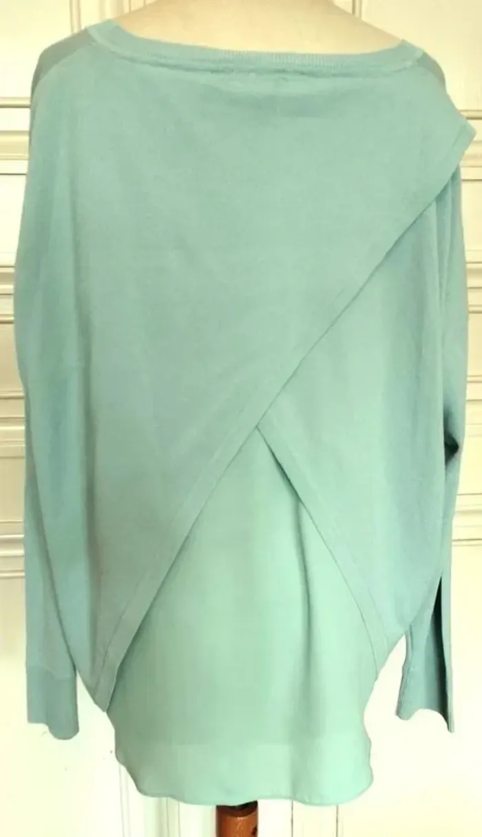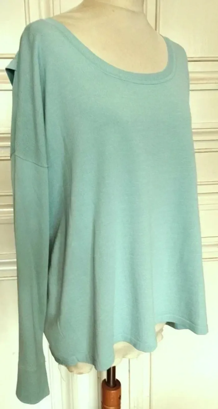 ELOGY PULL T XL TRES JOLI COLORIS BLEU NORDIQUE SOUPLE FLUIDE MI SAISON COUPE IMPECCABLE PORTé ULTRA AGREABLE INFROISSABLE EXTENSIBLE PAN CREPE ASYMETRIQUE AU DOS EPAULES 71 CM BUSTE 66 CM TAILLE ET BAS 64 CM MANCHES 50 CM LONGUEUR 71 CM