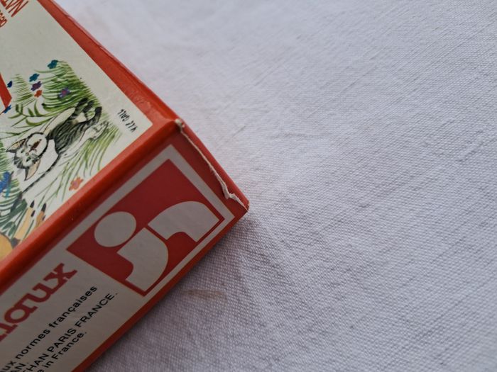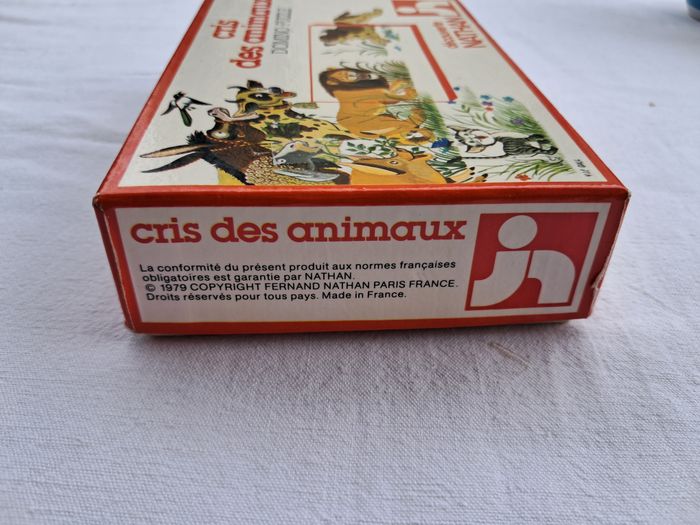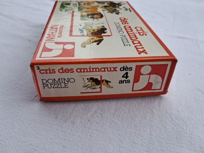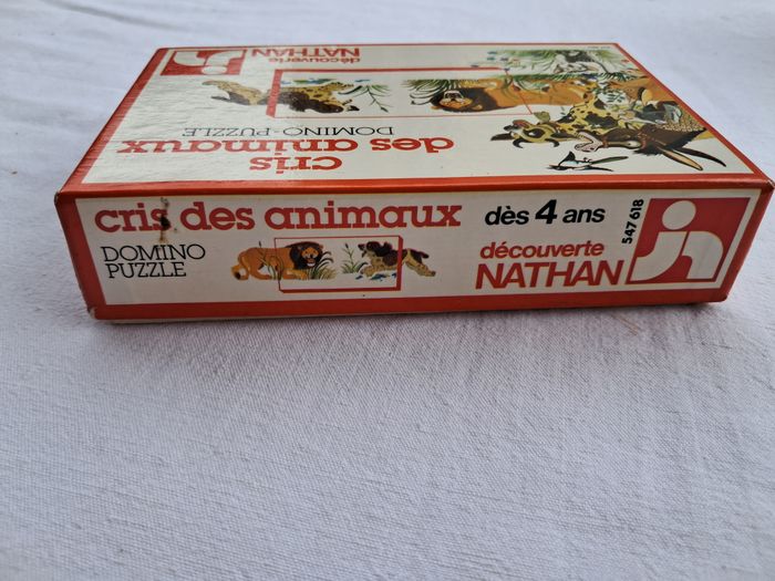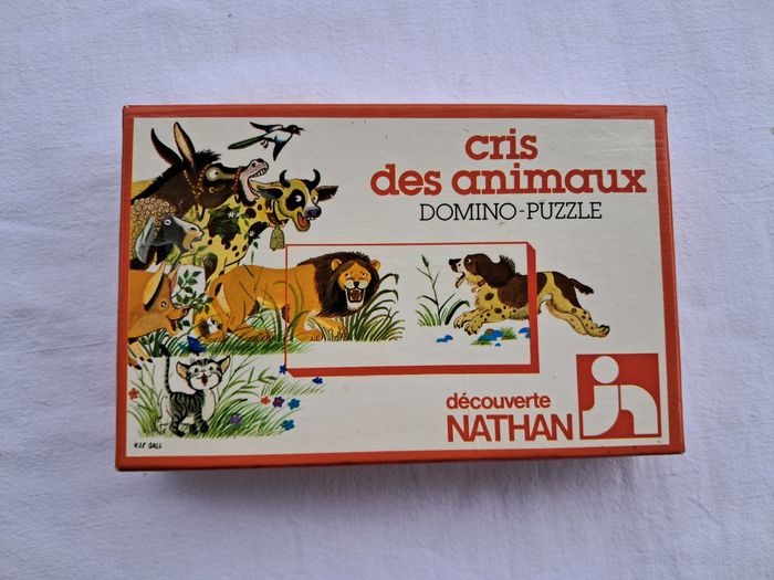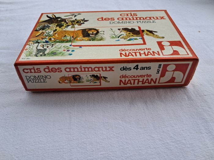Domino puzzle cris des animaux vintage ancien Jeux découverte Nathan 1979 Dès 4 ans Dimensions de la boite : 15 x 10 x 3,5 cm Poids total : 157 grammes Beaucoup utilisés, traces d'usures et du temps, tâches, abimés, scotch.... voir les photos Bon état