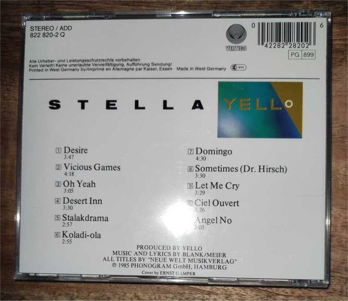 🎵 Yello 🎵 Stella Réf Vertigo 822 820-2 Q CD 11 titres 1 - Desire 2 - Vicious Games 3 - Oh Yeah 3:05 4 - Desert Inn 5 - Stalakdrama 6 - Koladi-Ola 7 - Domingo 8 - Sometimes (Dr. Hirsch) 9 - Let Me Cry 10 - Ciel Ouvert 11 - Angel No .