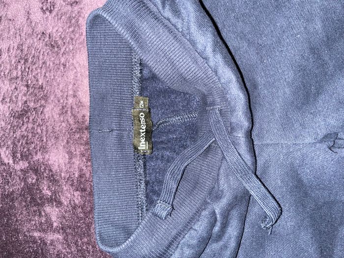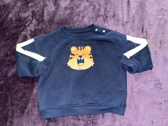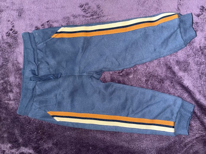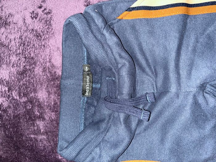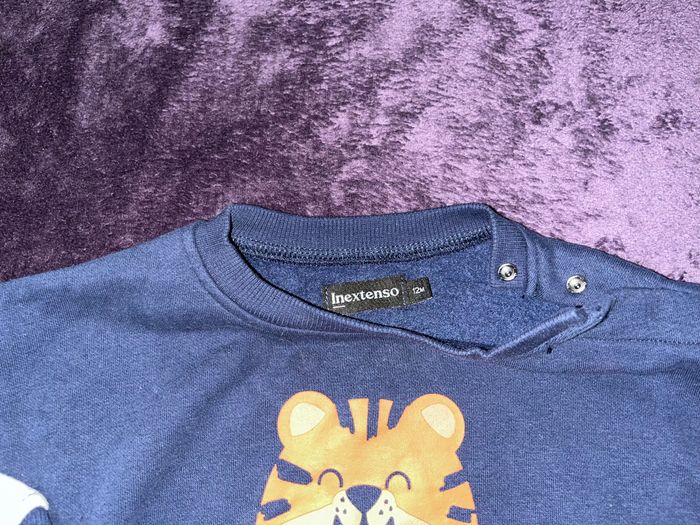 - 1 sweat (bouton à pression sur l'épaule gauche) bleu marine avec motif tigre + pantalon assorti (rayures latérales jaunes et blanches) - 1 pantalon de jogging bleu marine uni taille 12 mois marque IN EXTENSO Ensemble confortable et pratique pour les petits aventuriers. Bon état. #ensemblejoggingbebegarcon12mois
