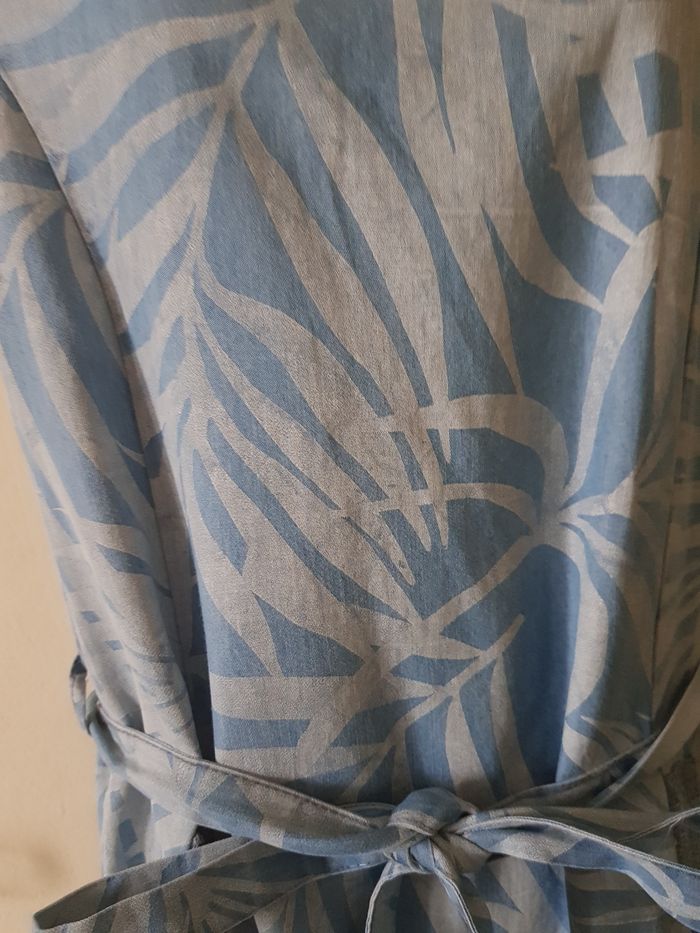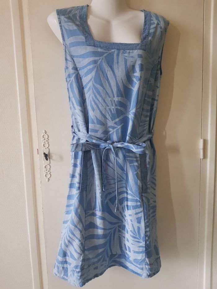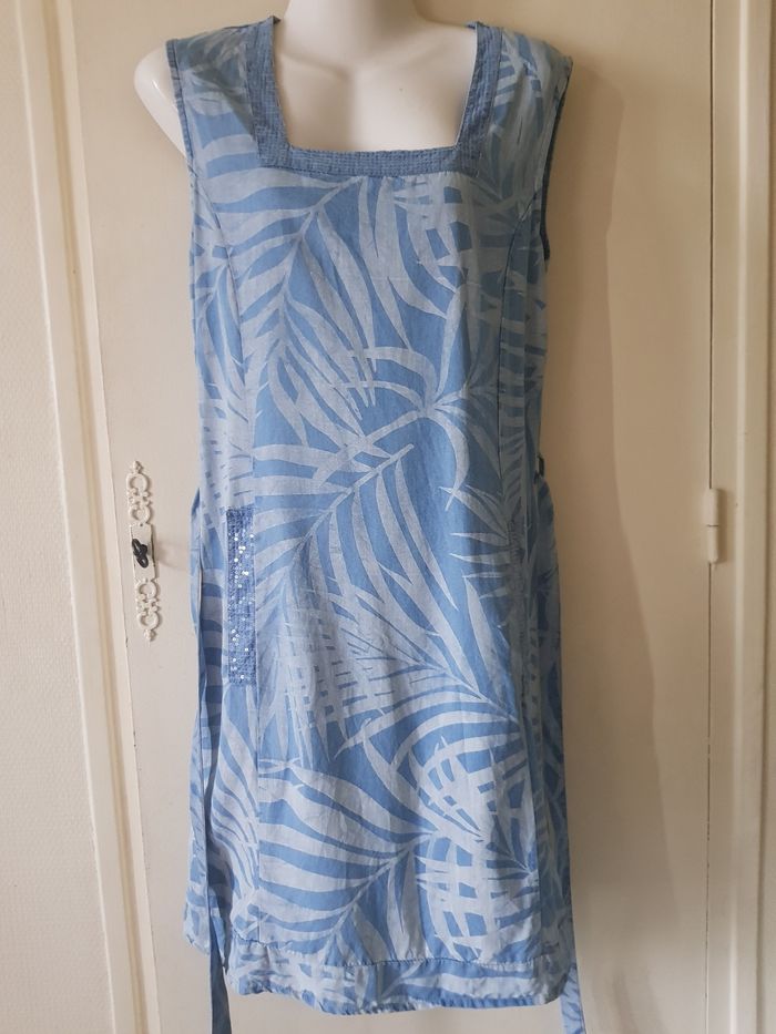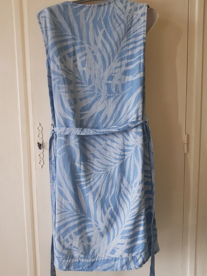 Robe femme sans manches, coloris bleu clair à motif feuilles. Coupe droite avec ceinture à nouer pour marquer la taille. Matière fluide et légère, agréable à porter. Idéale pour l’été, les vacances ou le quotidien. Très bon état. 👉 Marque : Christine Laure 👉 Taille : 1 ( S )