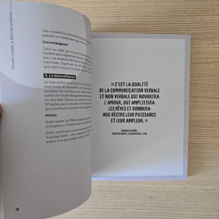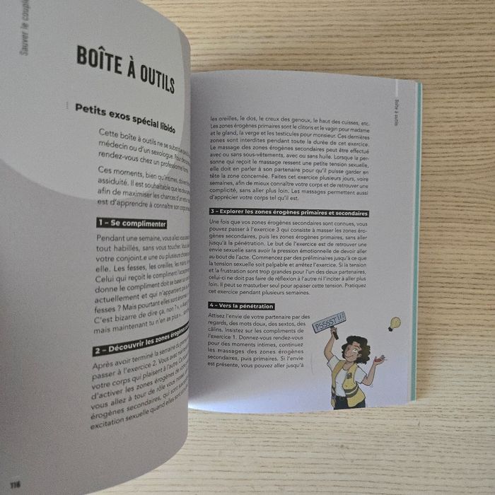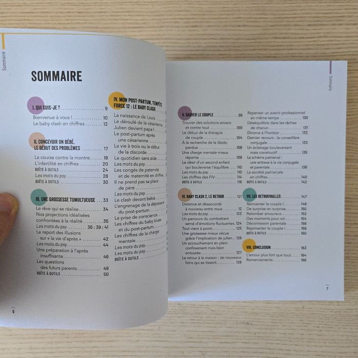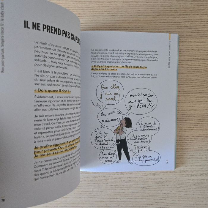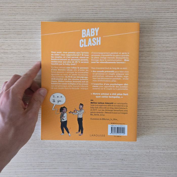 Comment protéger son couple après bébé Par Mélina Lecluze Amorotti Très bon état N'hésitez pas à aller sur mon profil pour d'autres livres Un livre de témoignage chronologique d'une jeune femme mariée et mère de deux enfants ayant vécu le baby clash, en 7 grands chapitres : 1. Qui suis-je ? 2. Le début des problèmes, la PMA. 3. Une grossesse tumultueuse. 4. Mon post partum, tempête force 12: le baby clash. 5. Le retour du couple. 6. Le retour du baby clash. 7. Les retrouvailles. Avec des boîtes à outils thématiques (mieux vivre la PMA en couple, partager la charge mentale, organiser une déconnexion parentale...), des conseils psy (l'impact de la grossesse sur la libido, les disputes devant bébé)... et des dessins humoristiques apportant une touche dédramatisante.