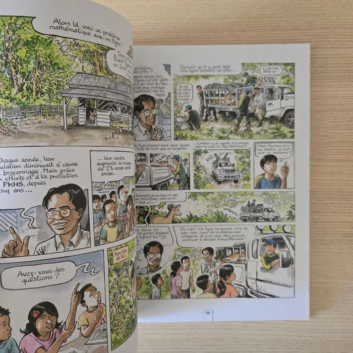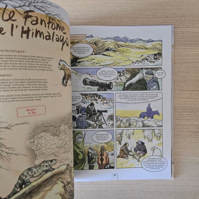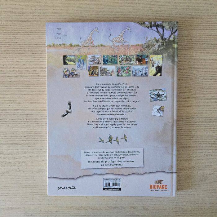 Par Gaet's Très bon état N'hésitez pas à aller sur mon profil pour d'autres livres C'est au milieu des années 80, au cours d'un voyage au Cachemire, que Pierre Gay (directeur du Bioparc de Doué-la-Fontaine) a rencontré Helen Freeman. Elle venait de créer le Snow Leopard Trust pour protéger les derniers spécimens d'un animal mythique, le < fantôme » de l'Himalaya : la panthère des neiges ! Il y a quarante ans et avant tout le monde, elle avait compris que la clé de la préservation des espèces menacées était le soutien aux communautés qui luttent pour leur survie en détruisant leur patrimoine naturel. Après avoir parcouru le monde à la recherche d'autres « fantômes » à sauver, Pierre Gay a lui-aussi appris que c'est en aidant les hommes qu'on sauvera la nature. Découvrez, au sein de ce véritable carnet de voyage, 18 projets de conservations animales soutenus par le Bioparc en bande dessinée. 18 façons de protéger des animaux... et des hommes !