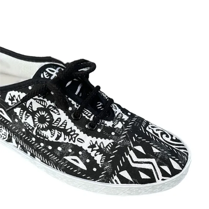 Ces chaussures en toile noires et blanches à lacets offrent un style casual et confortable. Leur semelle blanche en élastomère garantit une bonne adhérence et une souplesse agréable à chaque pas. Parfaites pour un usage quotidien, elles allient légèreté et allure moderne.